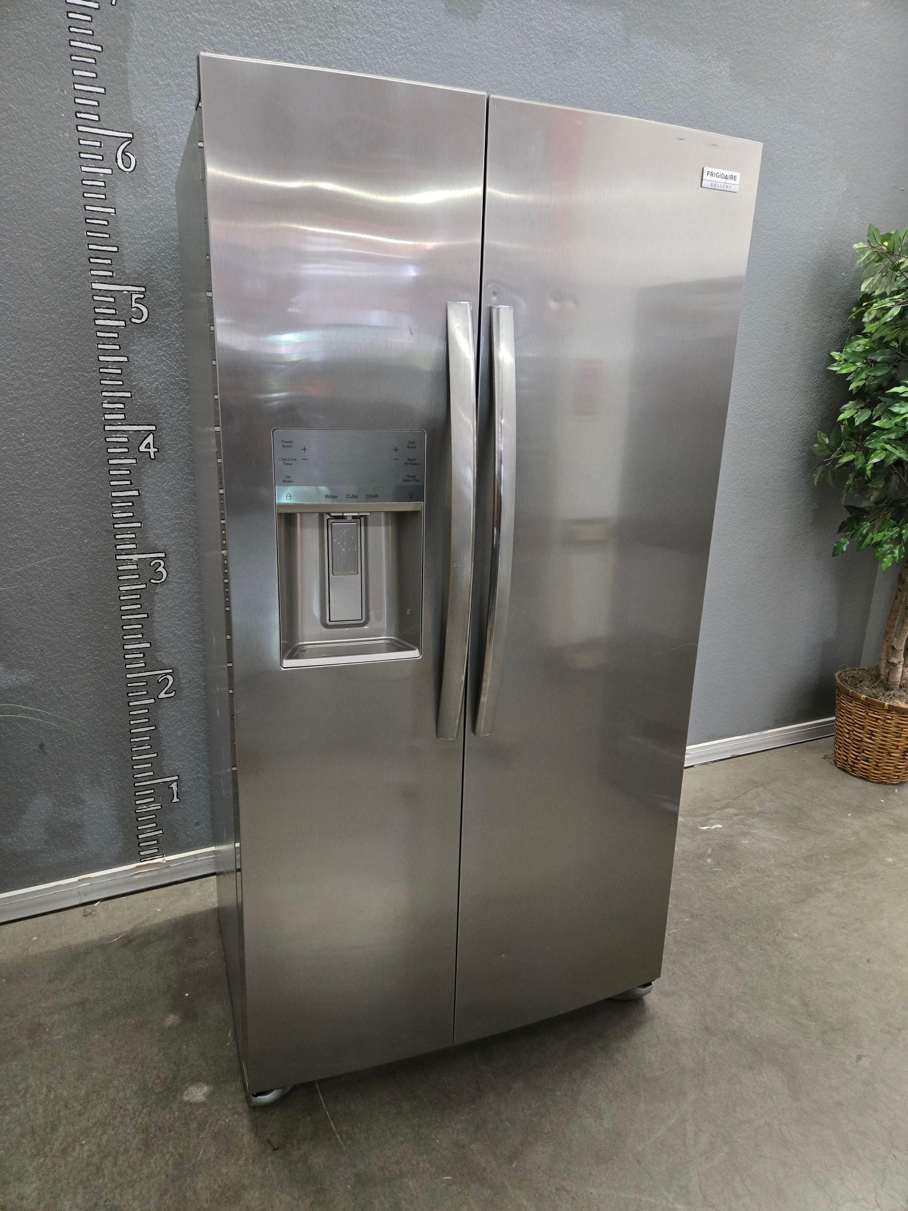 This elegant Frigidaire side-by-side refrigerator features a sleek stainless steel finish, offering a modern and stylish look for your kitchen. With ample space and convenient in-door water dispenser, it combines functionality with aesthetic appeal. Approximate Size: 6.6 x 3 x 3