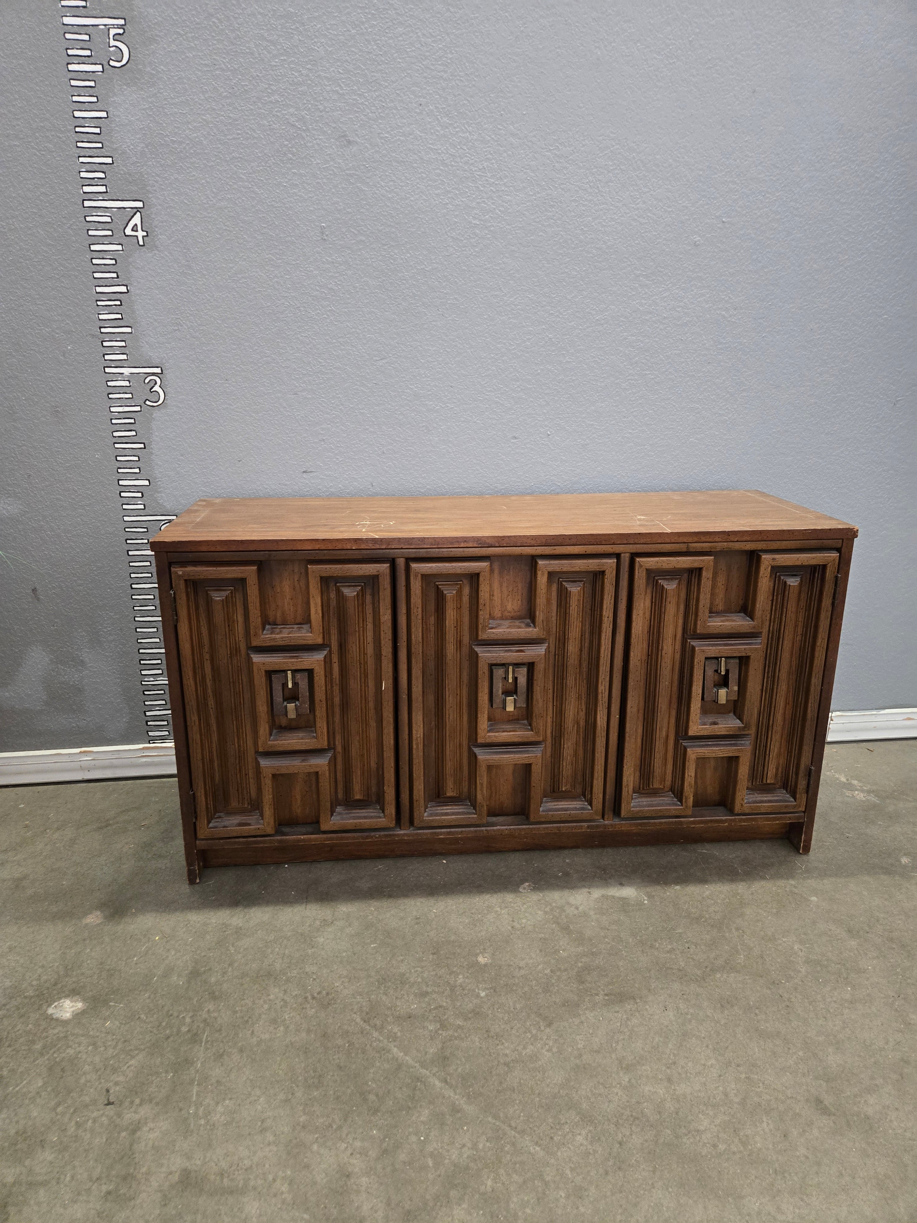 This elegant vintage sideboard cabinet features a rich brown wood finish with intricate geometric patterns on the doors. Perfect for adding a touch of classic charm to your living room. Approximate Size: 2.5 x 5 x 1.5