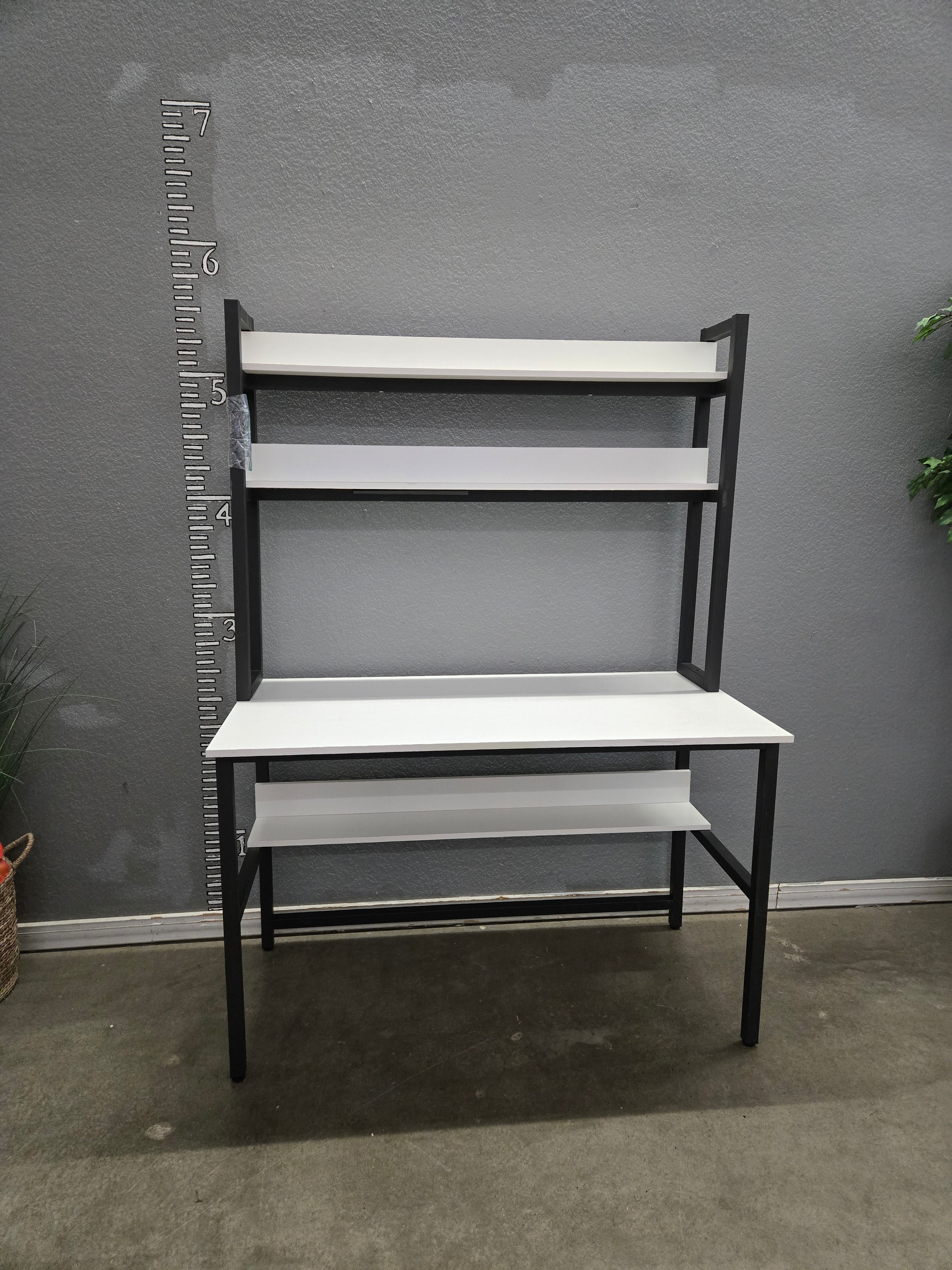 A sleek and modern desk with built-in shelves featuring a black metal frame and white laminated surfaces. Perfect for office or study room setups. Approximate Size: 5.5 x 3 x 1.5