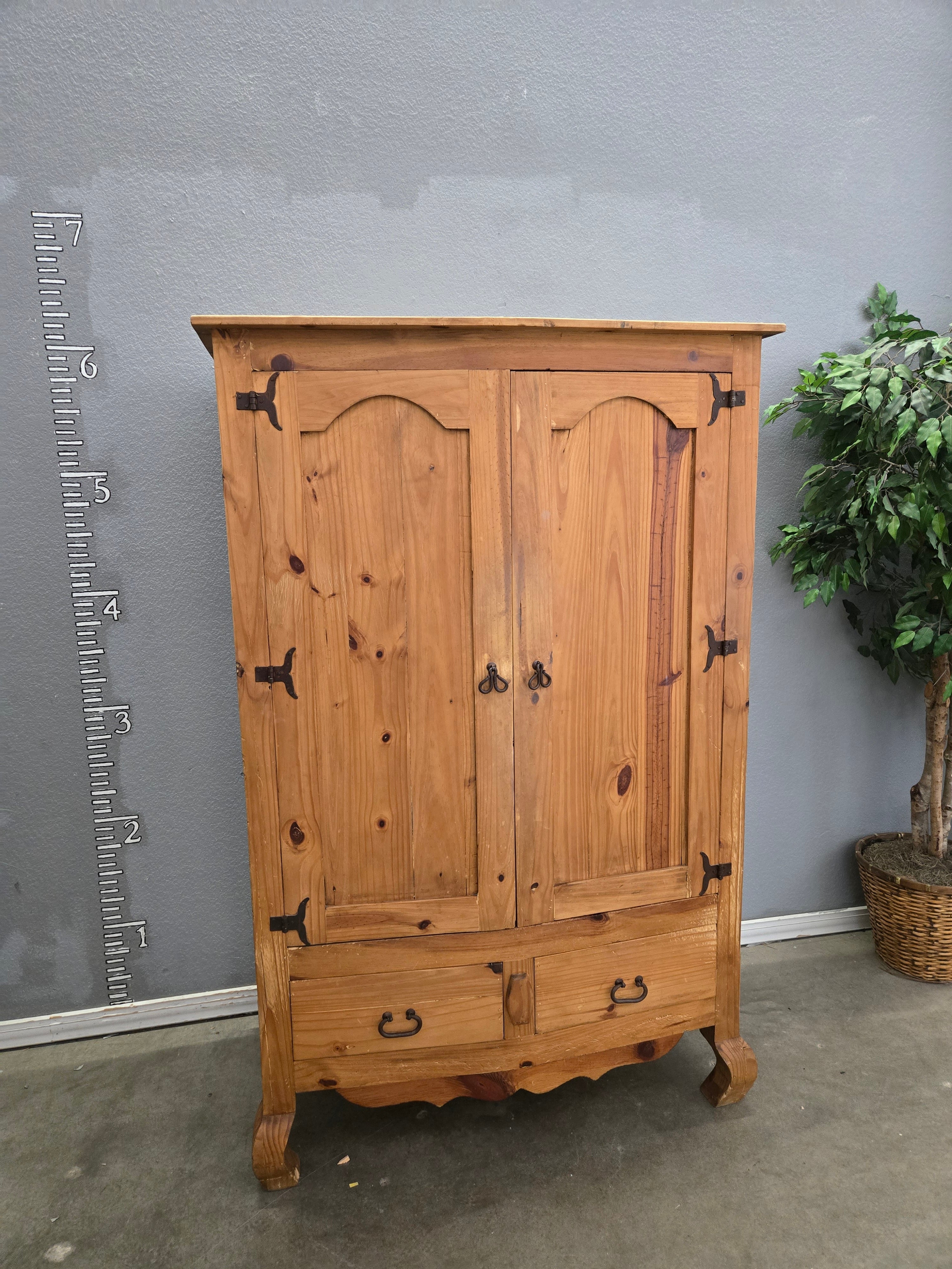 A charming rustic wooden armoire featuring a natural wood finish and accented with black metal hinges. The design includes two doors and two drawers, providing ample storage space. Approximate Size: 6 x 3 x 1.5