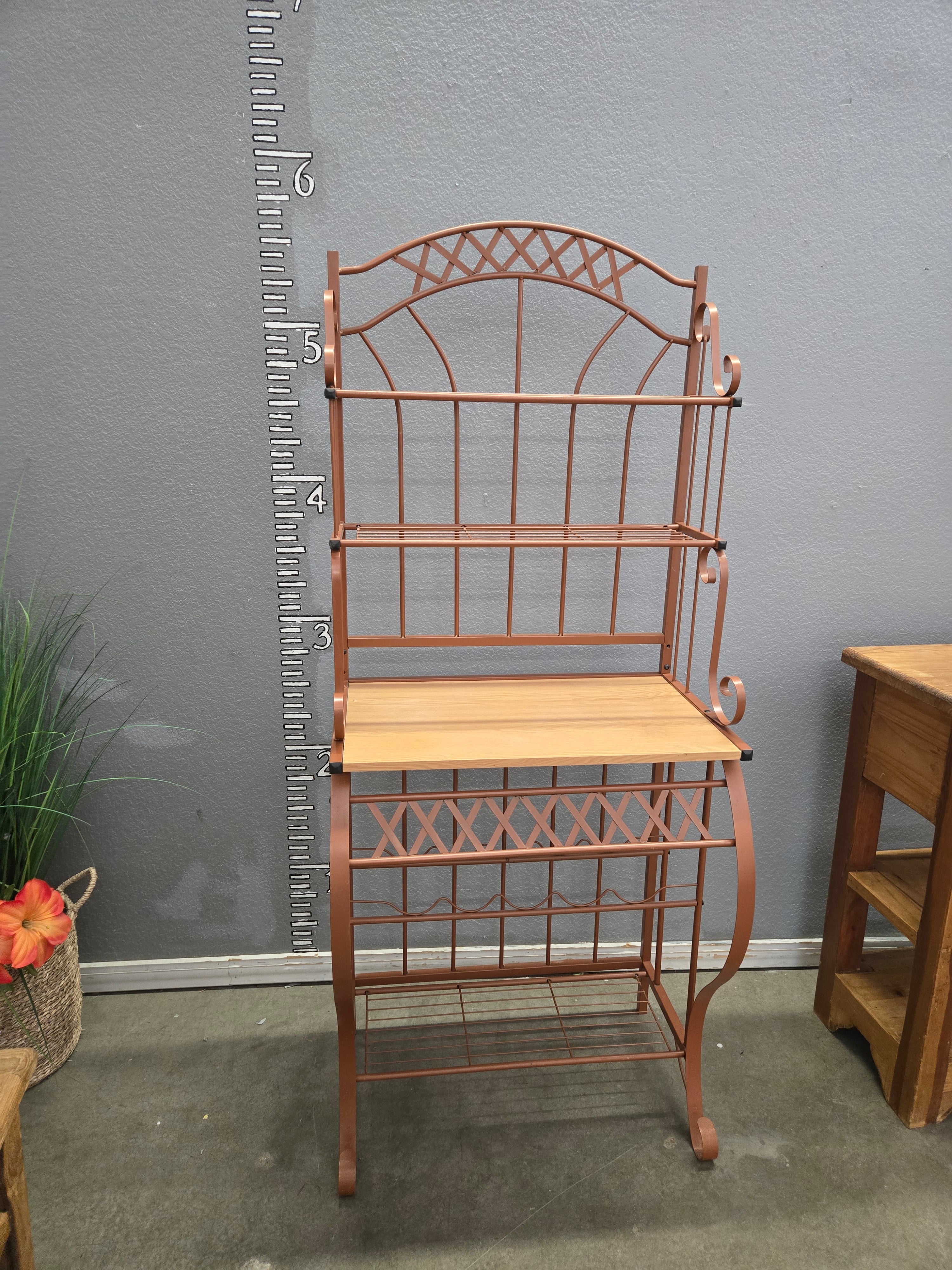 This charming baker's rack features a warm copper-colored finish with a wood accent shelf. Its rustic design adds a touch of elegance and practicality to any kitchen setting. Approximate Size: 5.5 x 2 x 1
