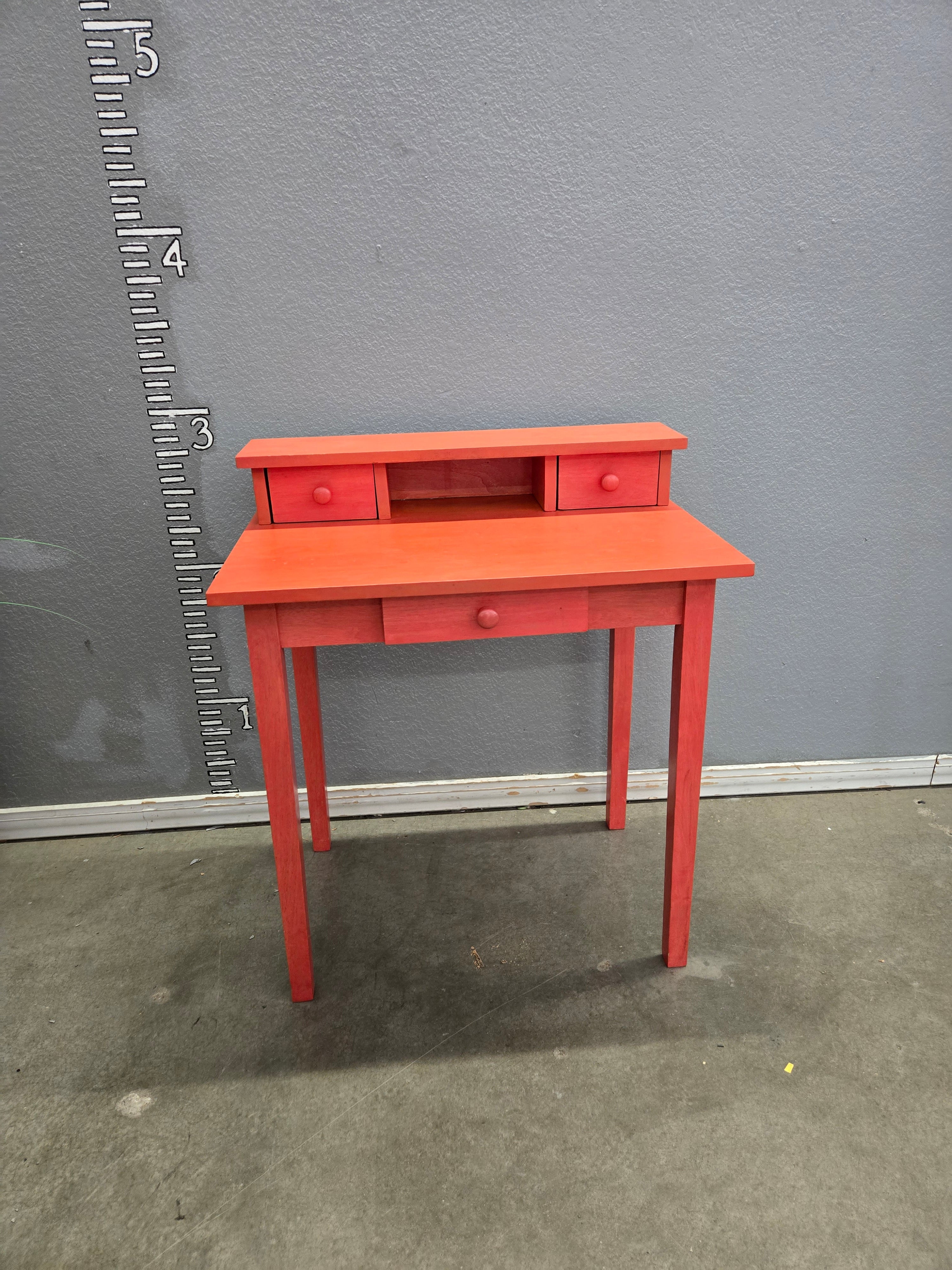 A charming small writing desk finished in vibrant red. Ideal for adding a pop of color to any room, this desk features two small drawers and a central shelf for organization. Constructed from sturdy wood, it showcases a matte finish. Approximate Size: 3 x 2 x 1