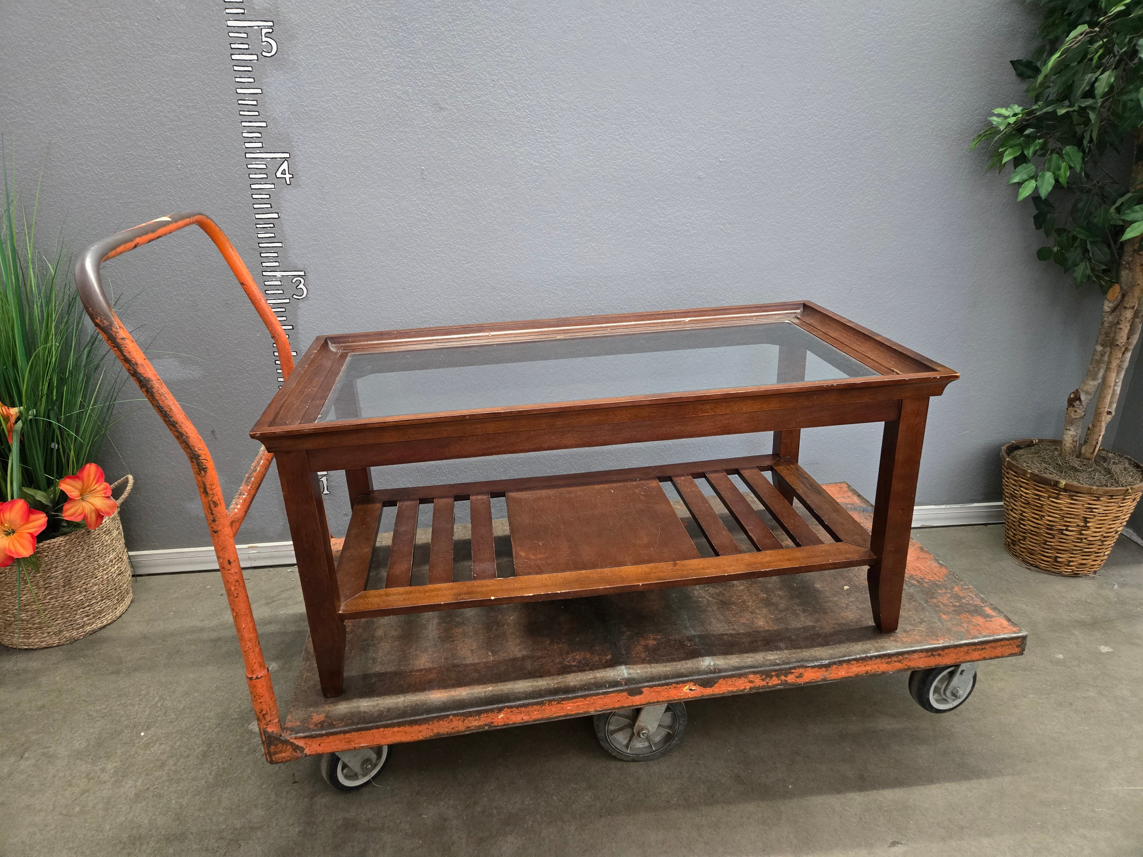 This elegant coffee table features a rich brown wooden frame with a glass top. The finish is smooth and polished, highlighting the natural beauty of the wood. Approximate Size: 1.5 x 3.5 x 1.5