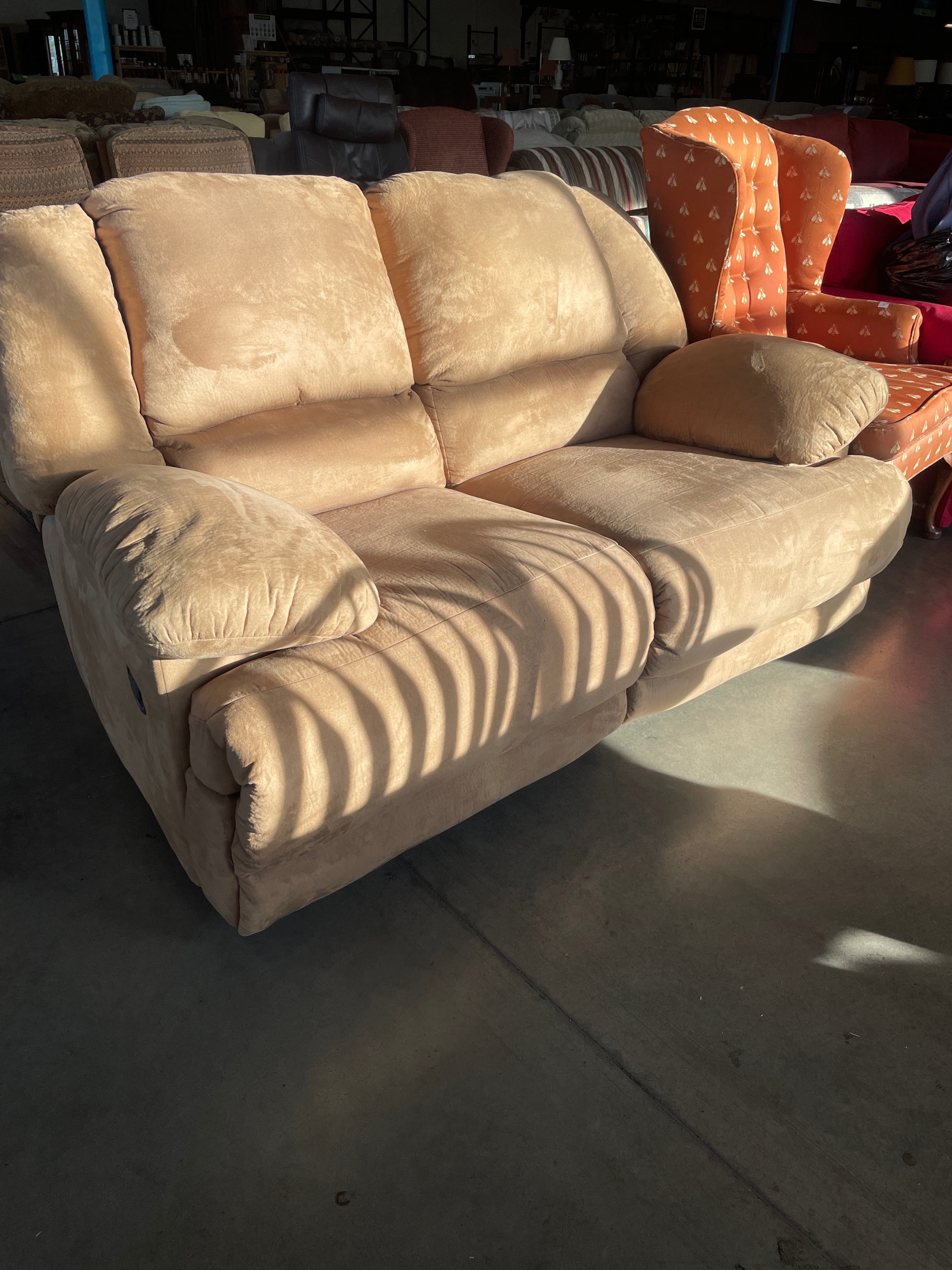 This comfortable reclining sofa features a plush tan fabric with a soft finish. Perfect for lounging, its inviting design complements both traditional and modern living room settings. Approximate Size: 3 x 6 x 3