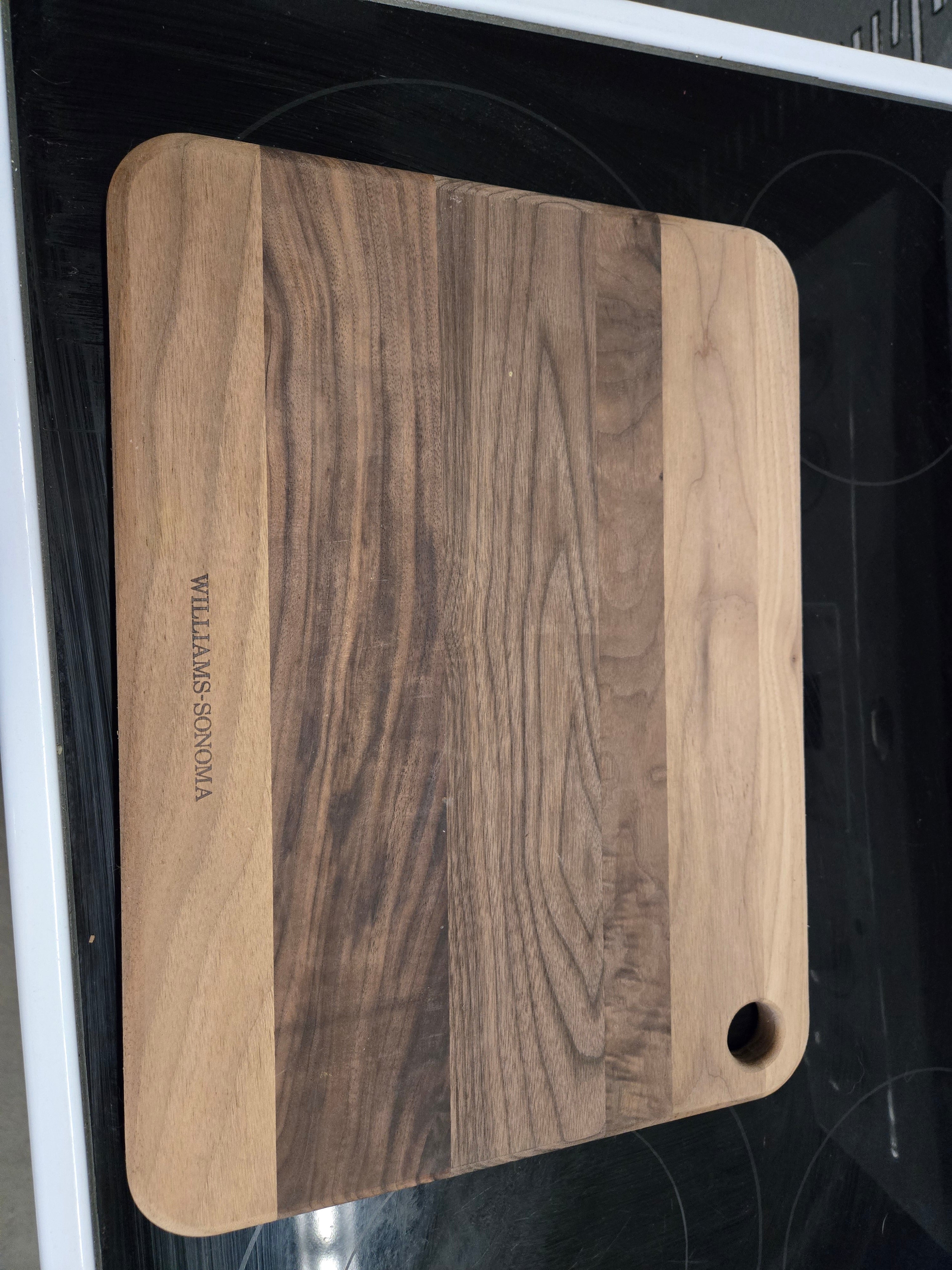 This elegant wooden cutting board features a natural wood finish with rich, varied tones. Crafted from durable hardwood, it showcases a multi-tone grain pattern and rounded edges for a smooth, functional design. Approximate Size: 0.5 x 1.5 x 1.2