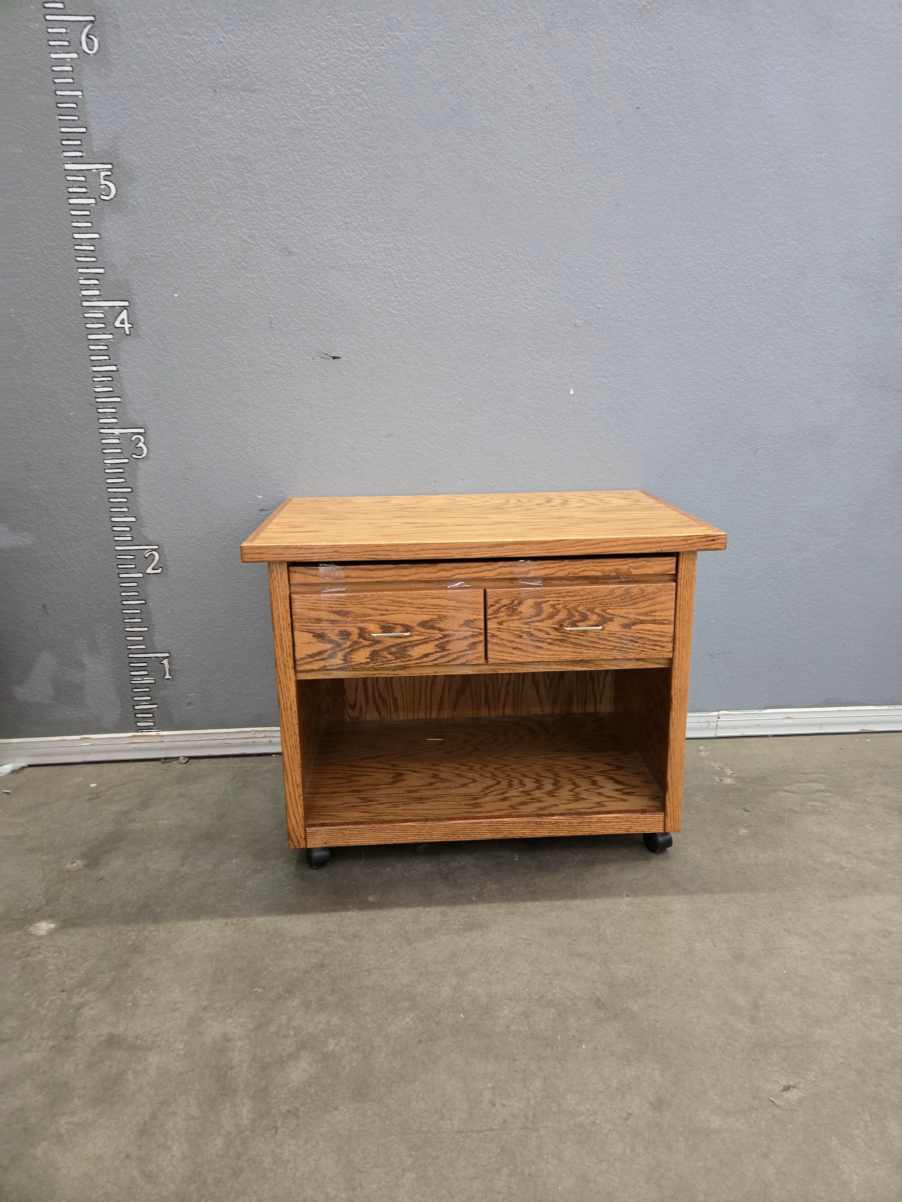This sturdy office cabinet features a natural oak wood finish with a smooth veneer. It includes a spacious drawer and an open shelf below, making it perfect for organizing office supplies or files. The cabinet sits on rolling casters for easy mobility and placement. Approximate Size: 2.5 x 2 x 1.5