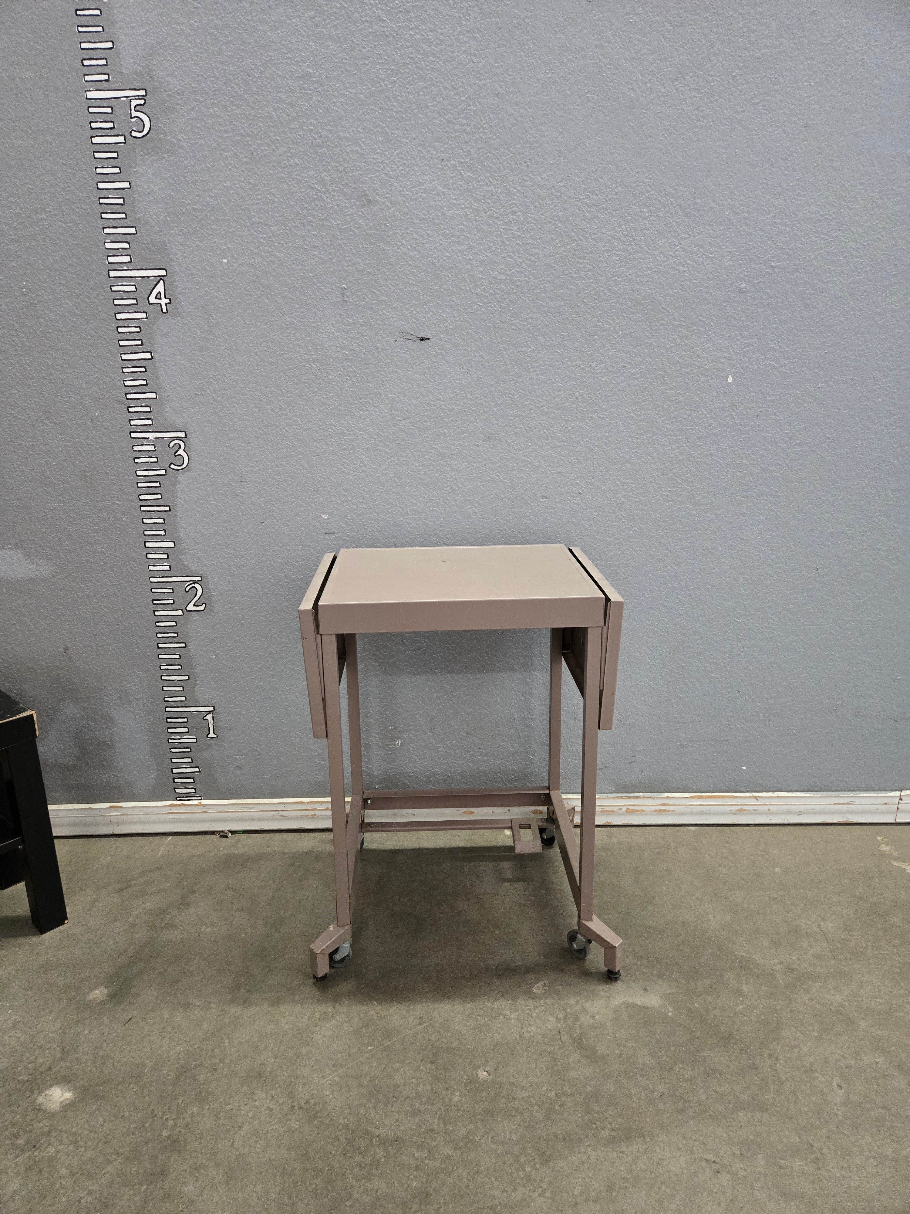 This durable table features a light gray metal finish and is equipped with swivel casters for easy mobility. Approximate Size: 2.5 x 2 x 1.5