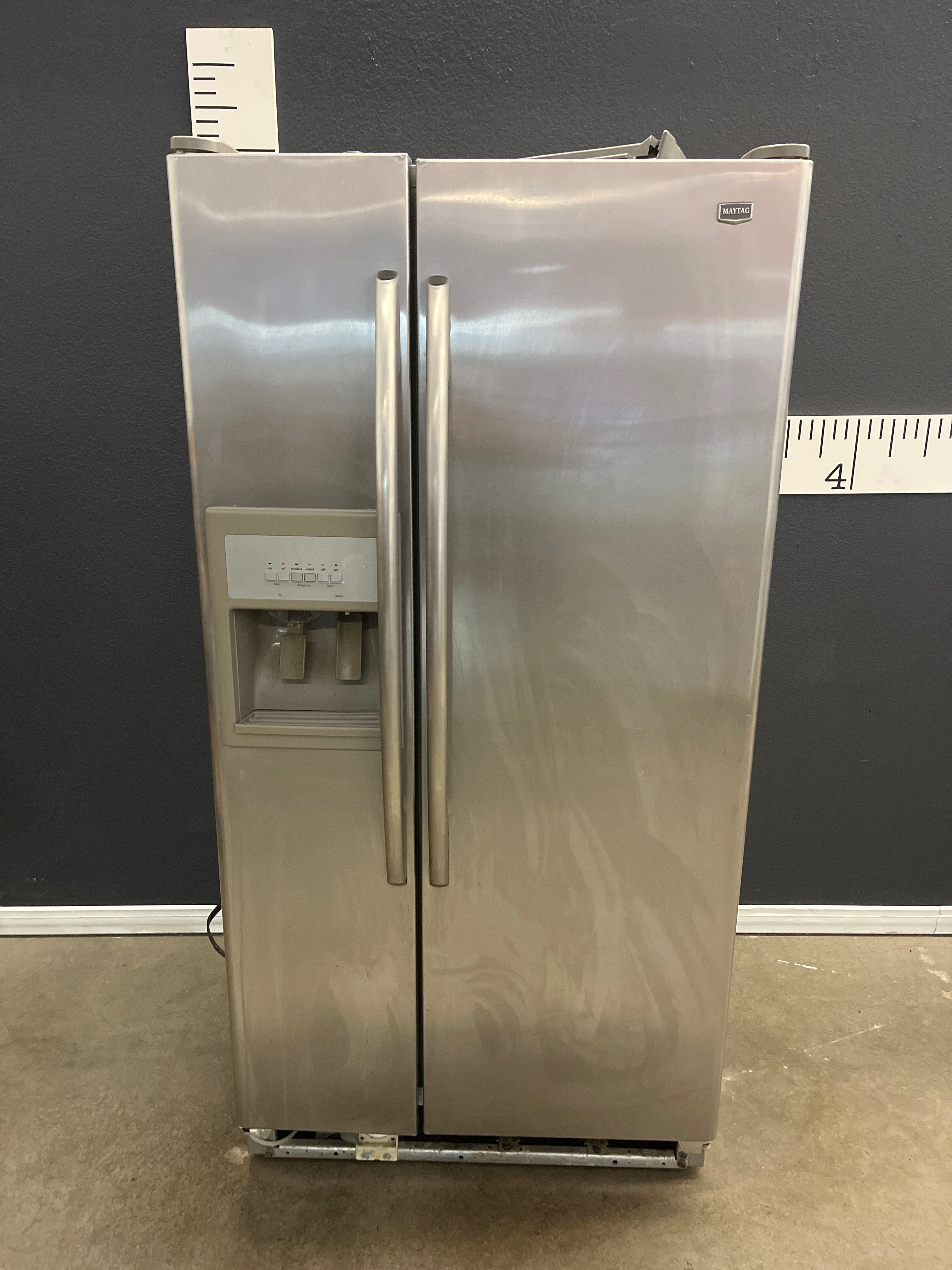 This modern stainless steel refrigerator features a sleek finish and a convenient side-by-side door design with an in-door water and ice dispenser. Perfectly suited for contemporary kitchens. Approximate Size: 6.5 x 3 x 3