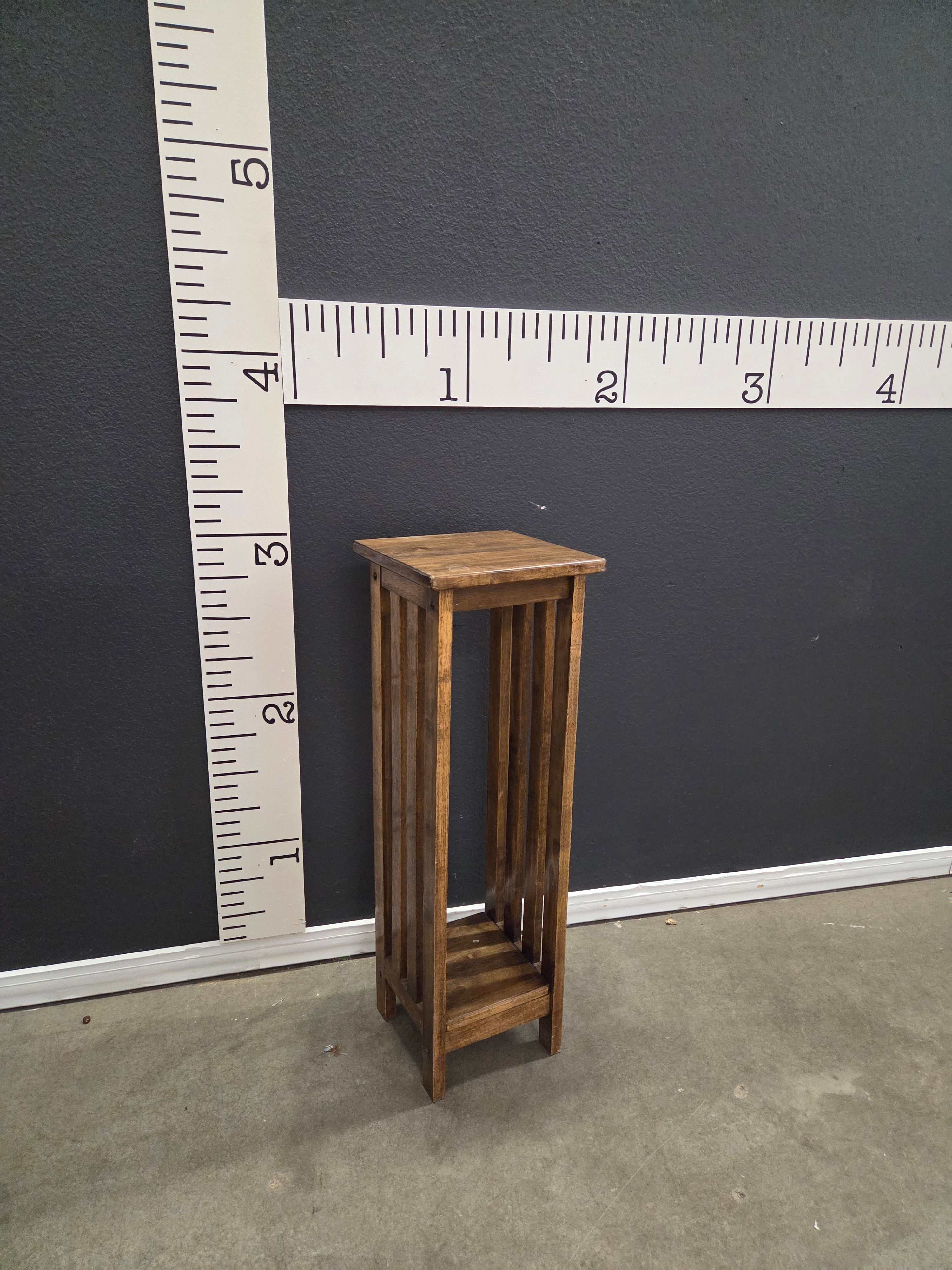 This rustic wooden pedestal stand features a natural wood finish, perfect for displaying plants or decorative items. Crafted from sturdy wood, its warm brown tone adds a touch of nature to any room. Approximate Size: 3 x 0.5 x 0.5