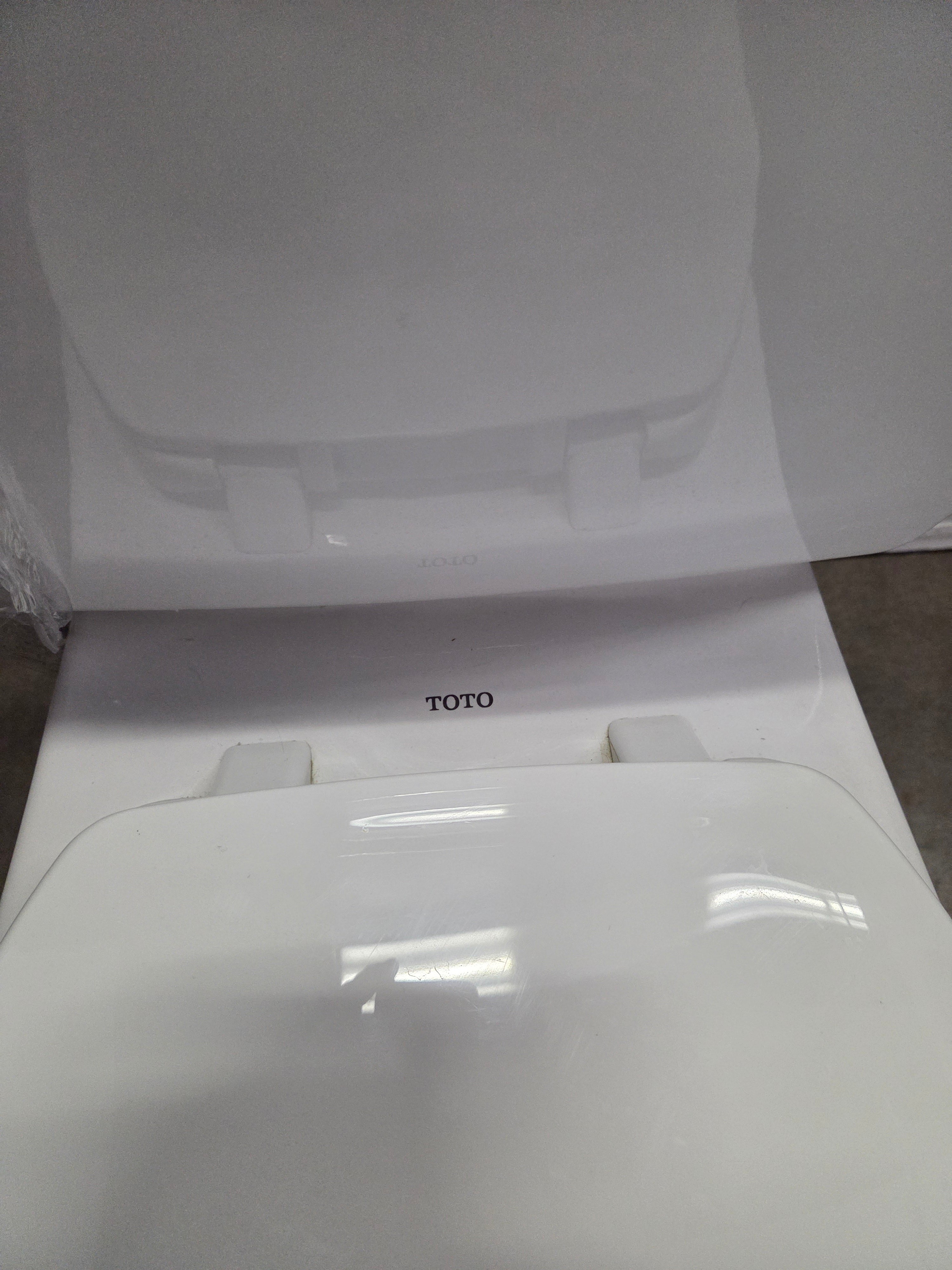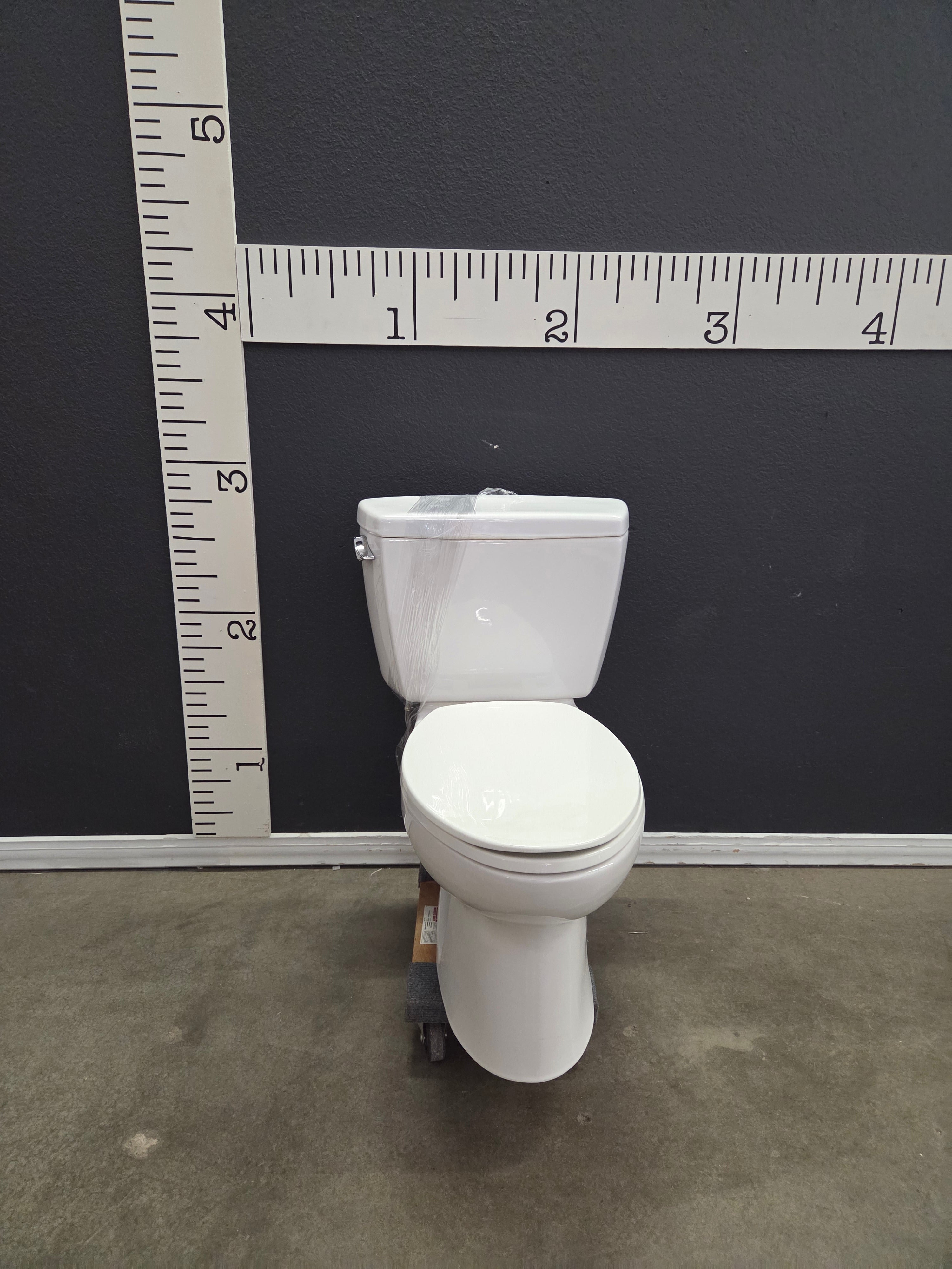 This sleek, white two-piece toilet features a glossy ceramic finish, perfect for a modern bathroom. The smooth surface ensures easy cleaning and timeless style. Approximate Size: 2.5 x 1.5 x 2.5
