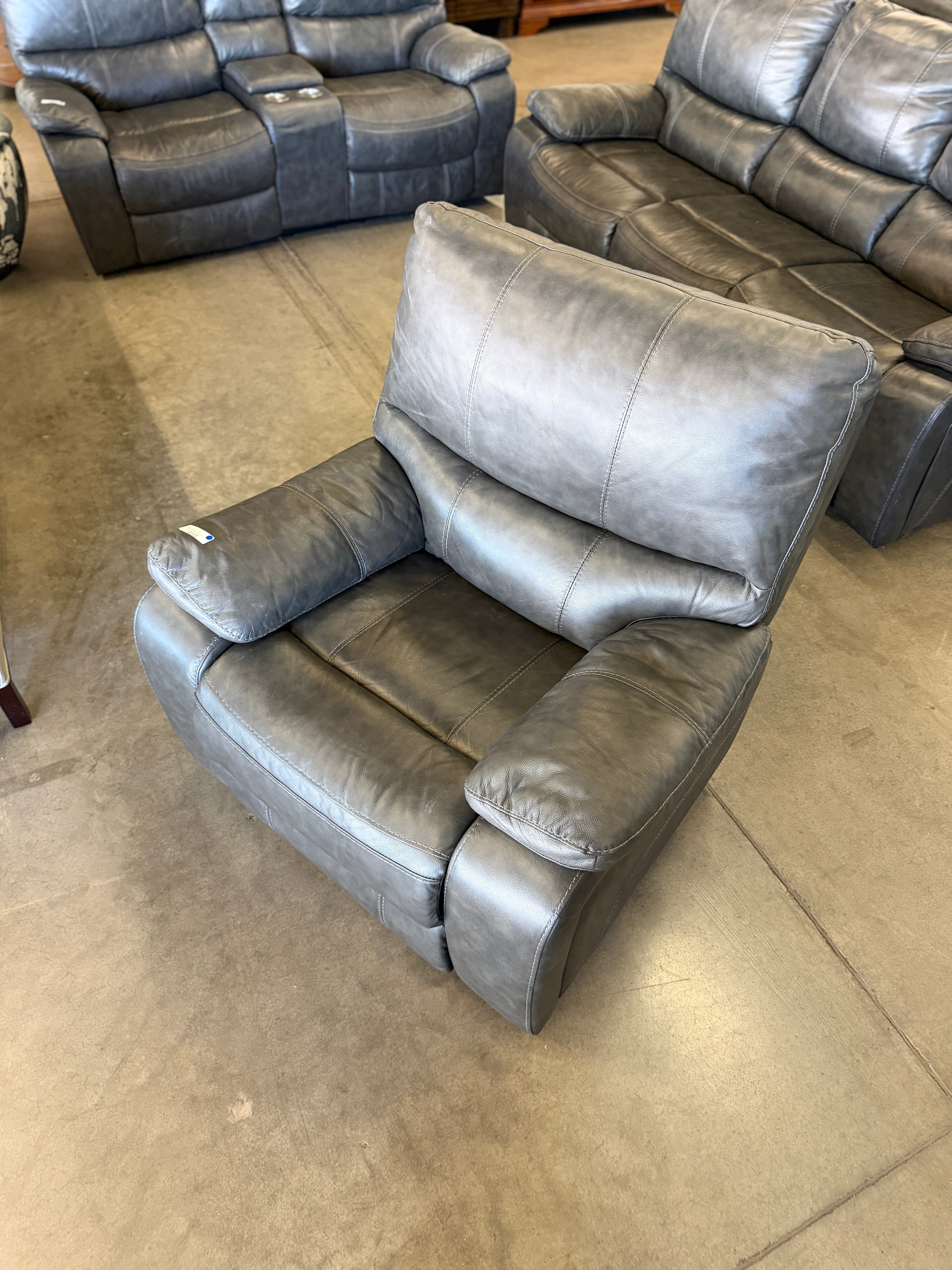 Experience unparalleled comfort with this plush dark gray leather recliner. The chair features a smooth leather finish, offering a sleek and luxurious appearance that complements any living room décor. Approximate Size: 3 x 3 x 3