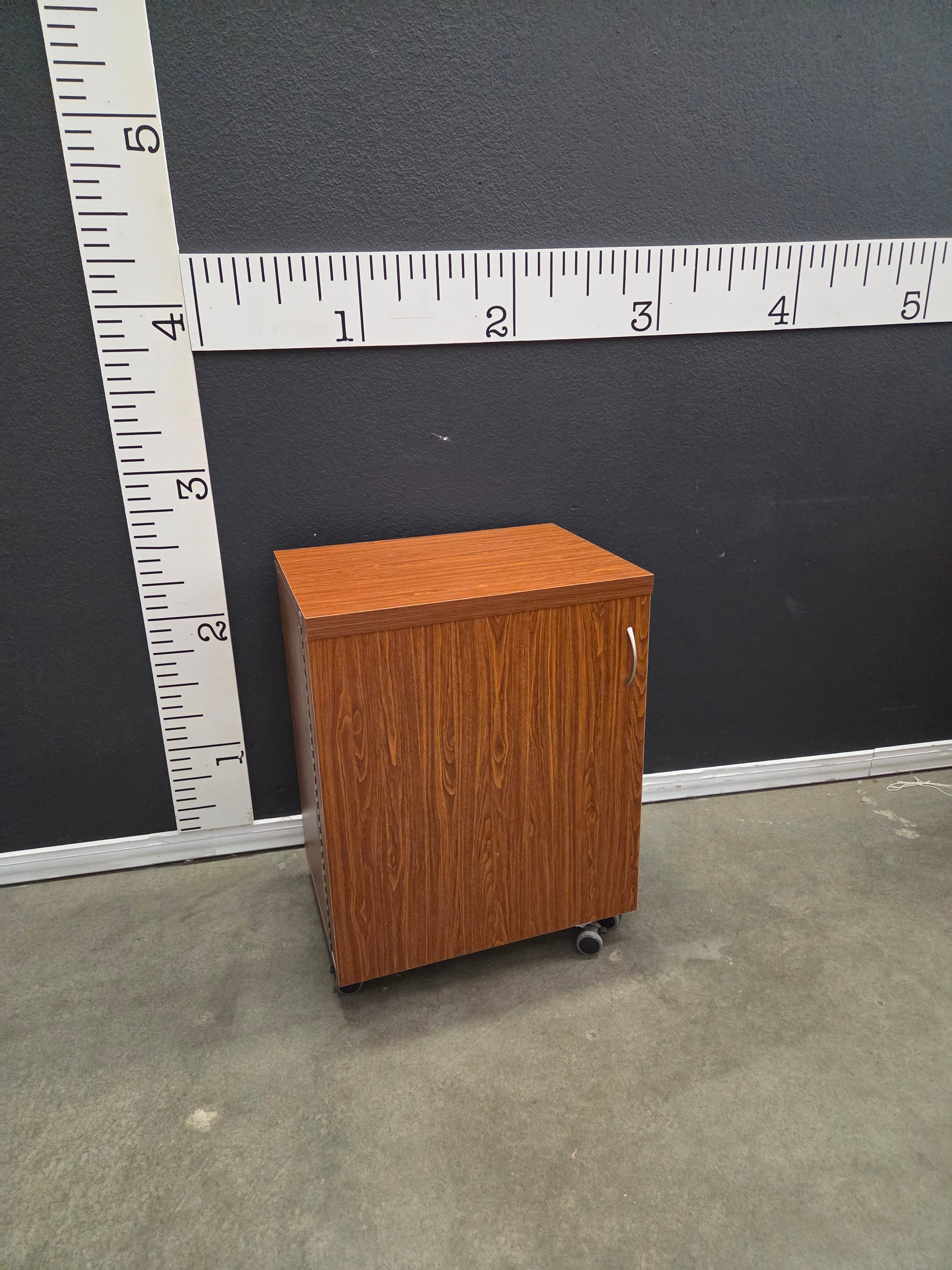 This compact sewing cabinet features a warm woodgrain finish and a sleek silver handle. It's designed for efficient storage in any office or home. The cabinet is mounted on wheels for easy mobility. Approximate Size: 2.5 x 1.5 x 1.5