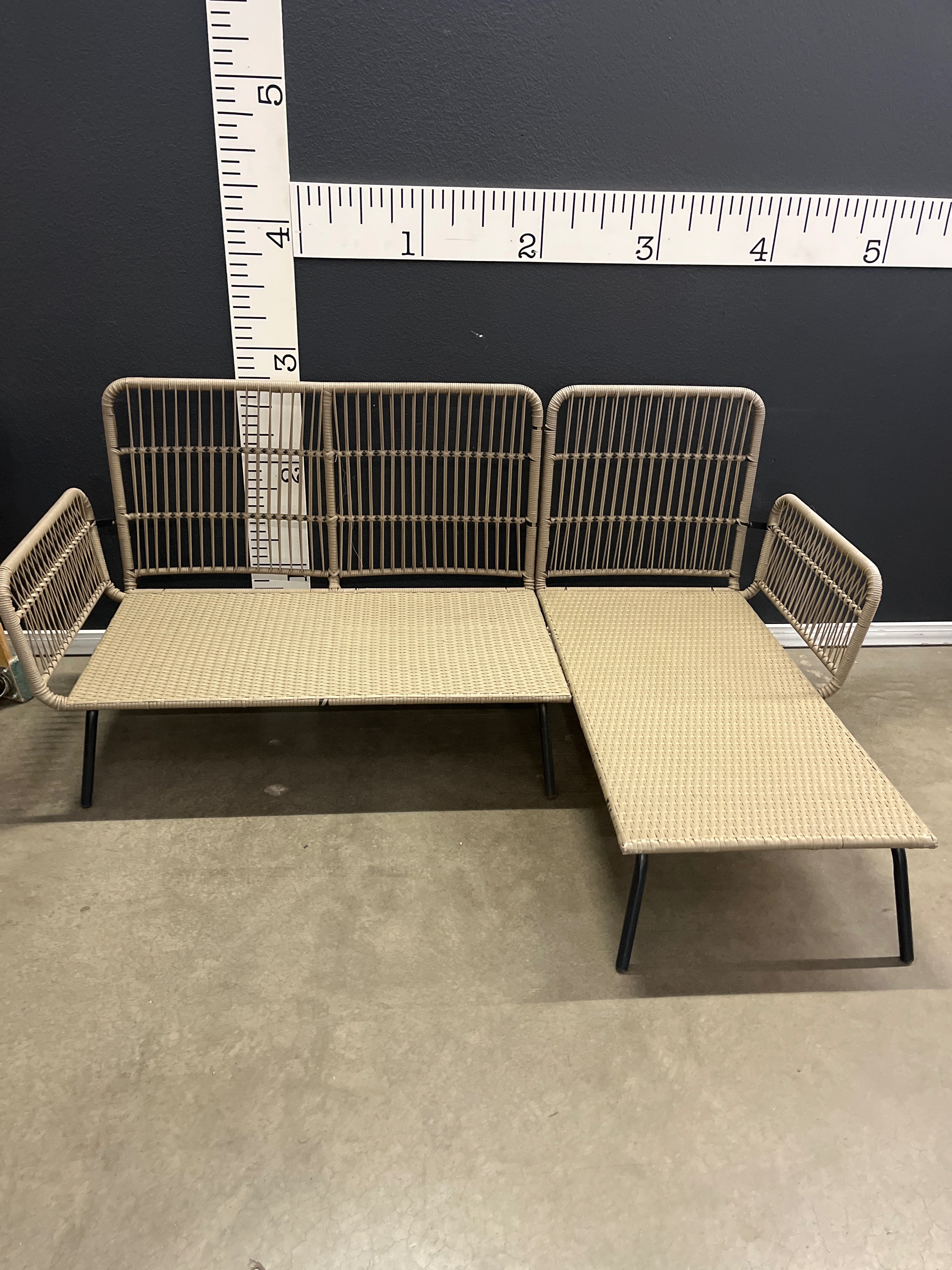 A chic and durable outdoor sectional sofa featuring a warm beige color with a woven rattan finish. Perfect for patio and outdoor living spaces. Approximate Size: 3 x 5 x 5