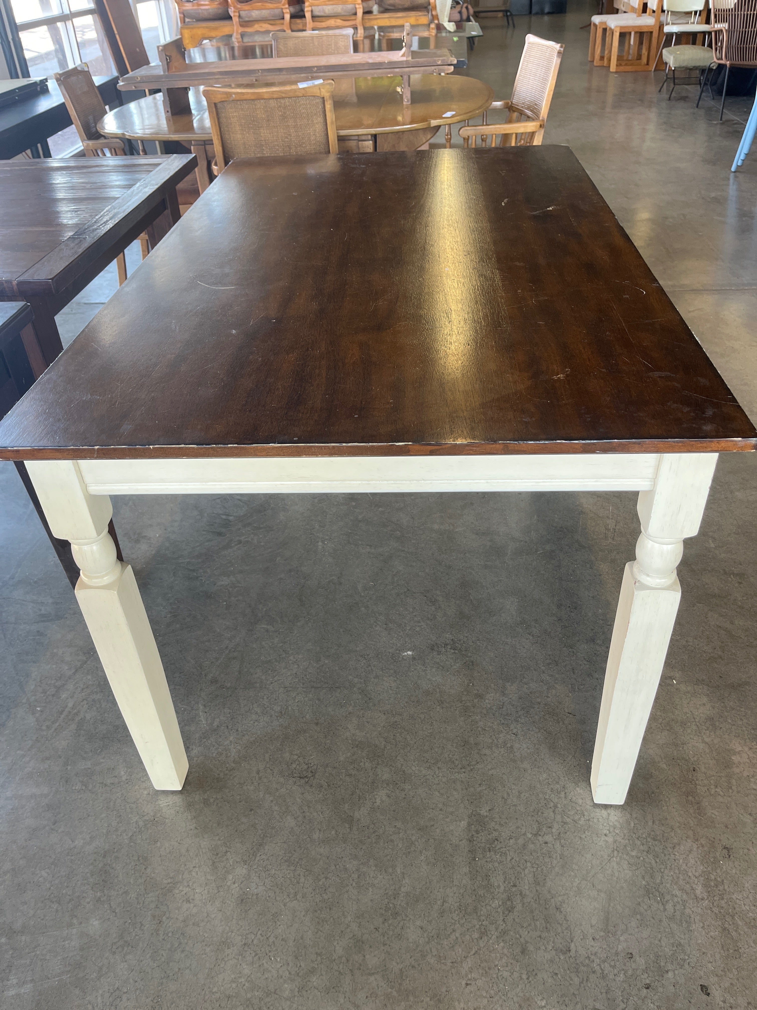 This charming dining table features a rich, dark wood finish top complemented by off-white painted legs, providing a rustic yet elegant touch to any dining room. Approximate Size: 3 x 3.5 x 3