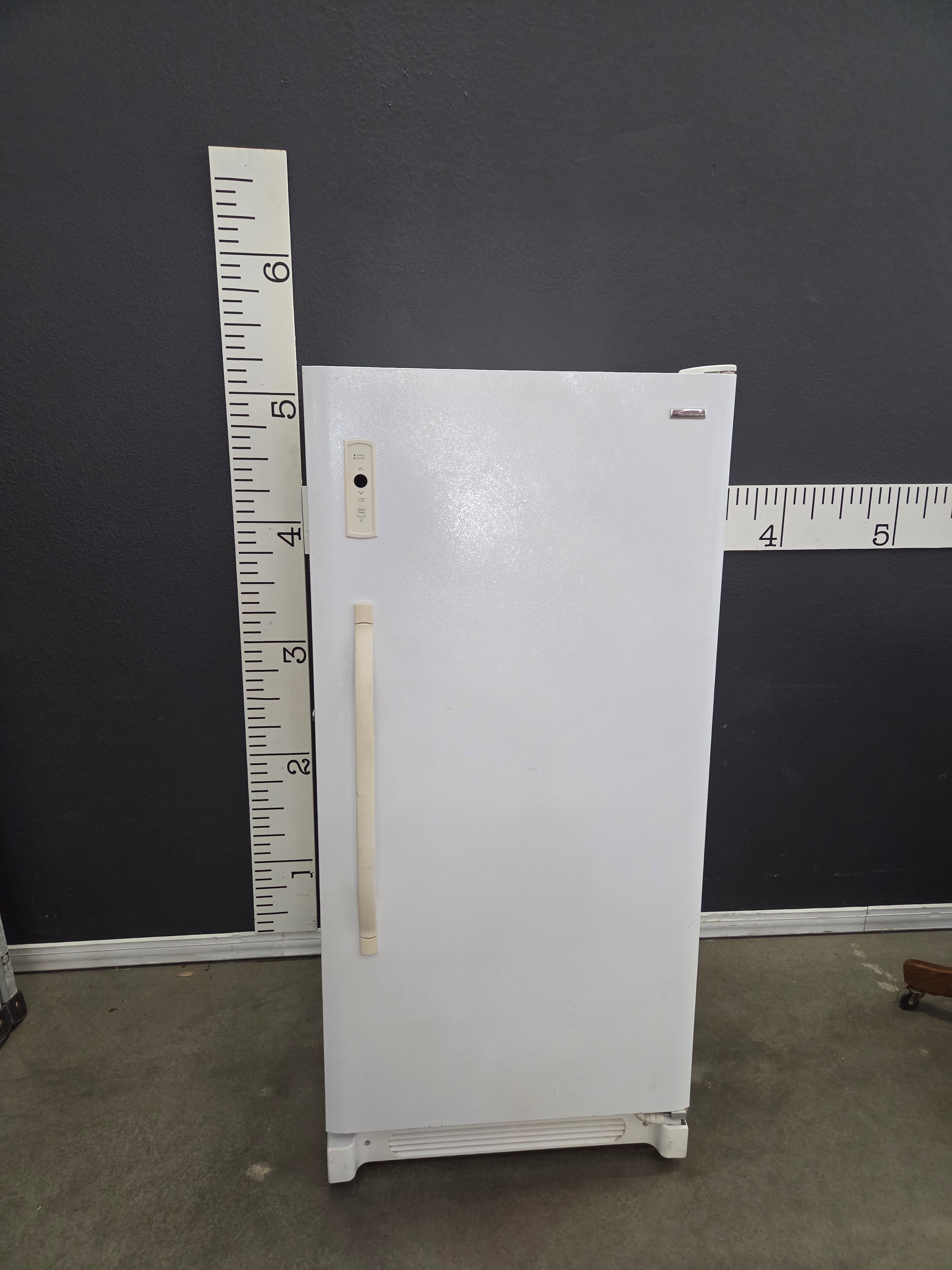 This upright deep freezer features a sleek white finish, perfect for any household. Its compact design ensures it fits well into any kitchen or garage space while offering ample storage for frozen goods. Approximate Size: 5.5 x 2 x 2
