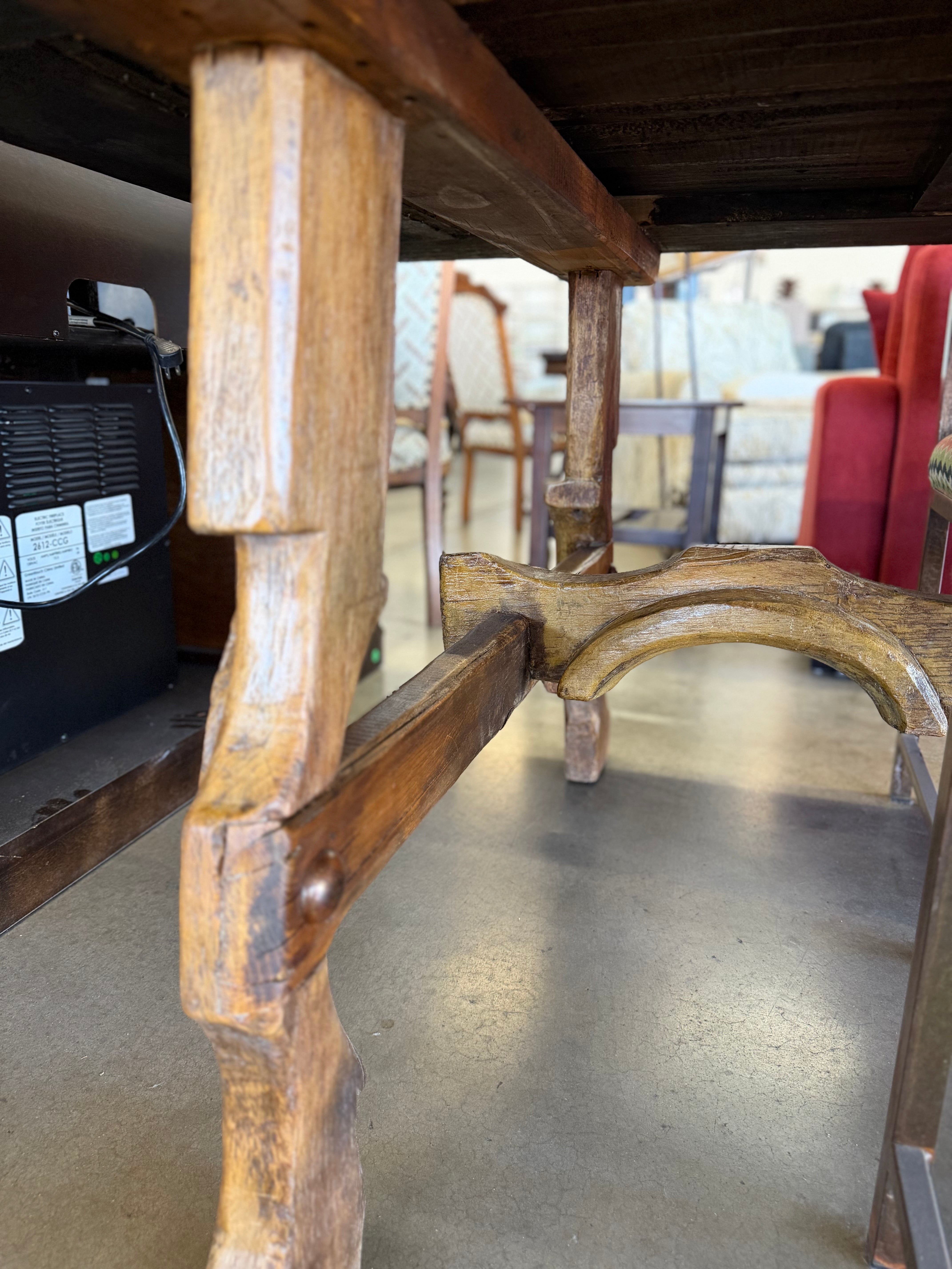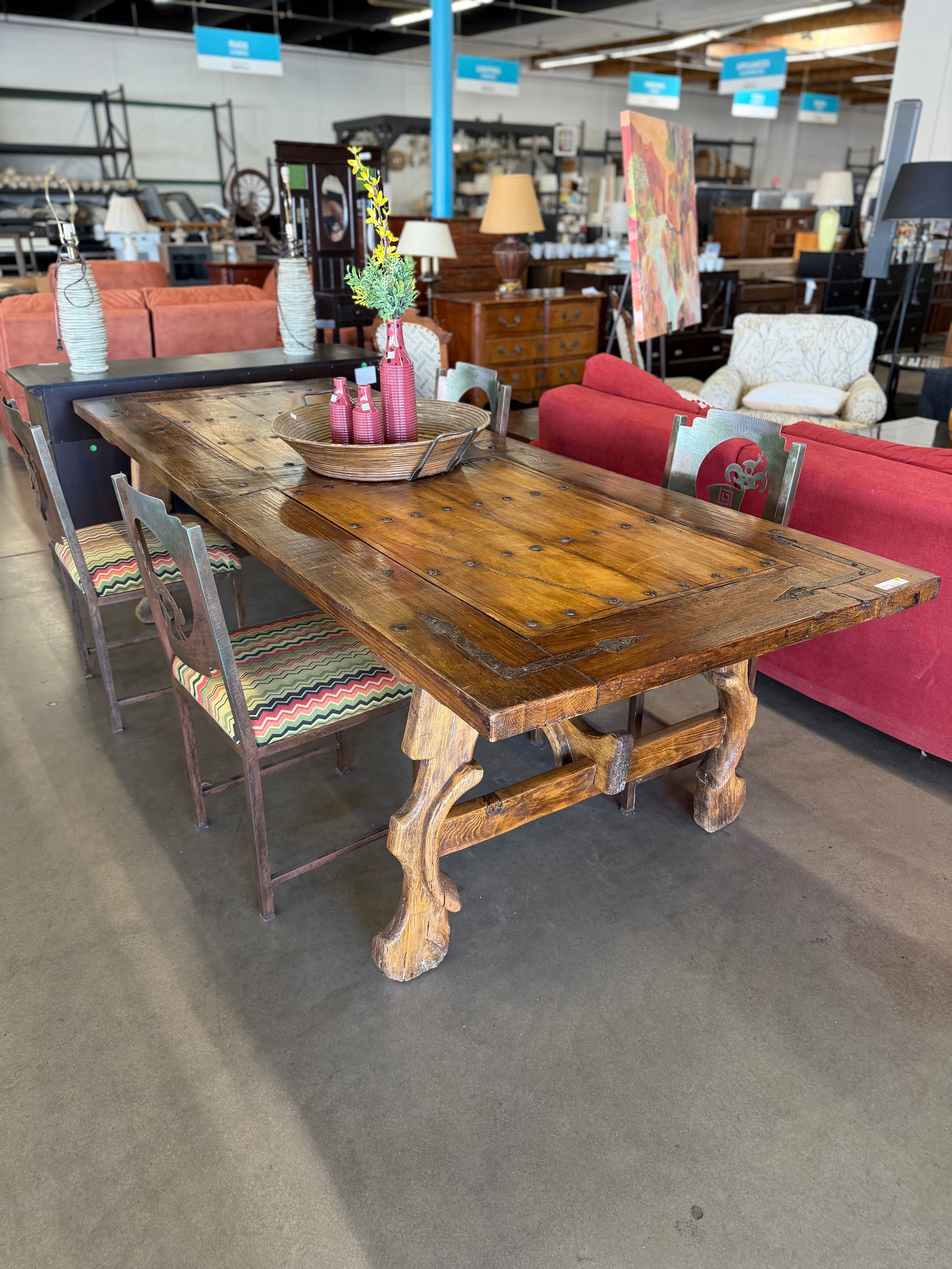 This elegant dining set features a sturdy, rustic wooden table with a natural finish, paired with six comfortable chairs upholstered in a rich blue fabric. Perfect for adding a touch of classic charm to any dining room. Approximate Size: 3 x 7 x 3