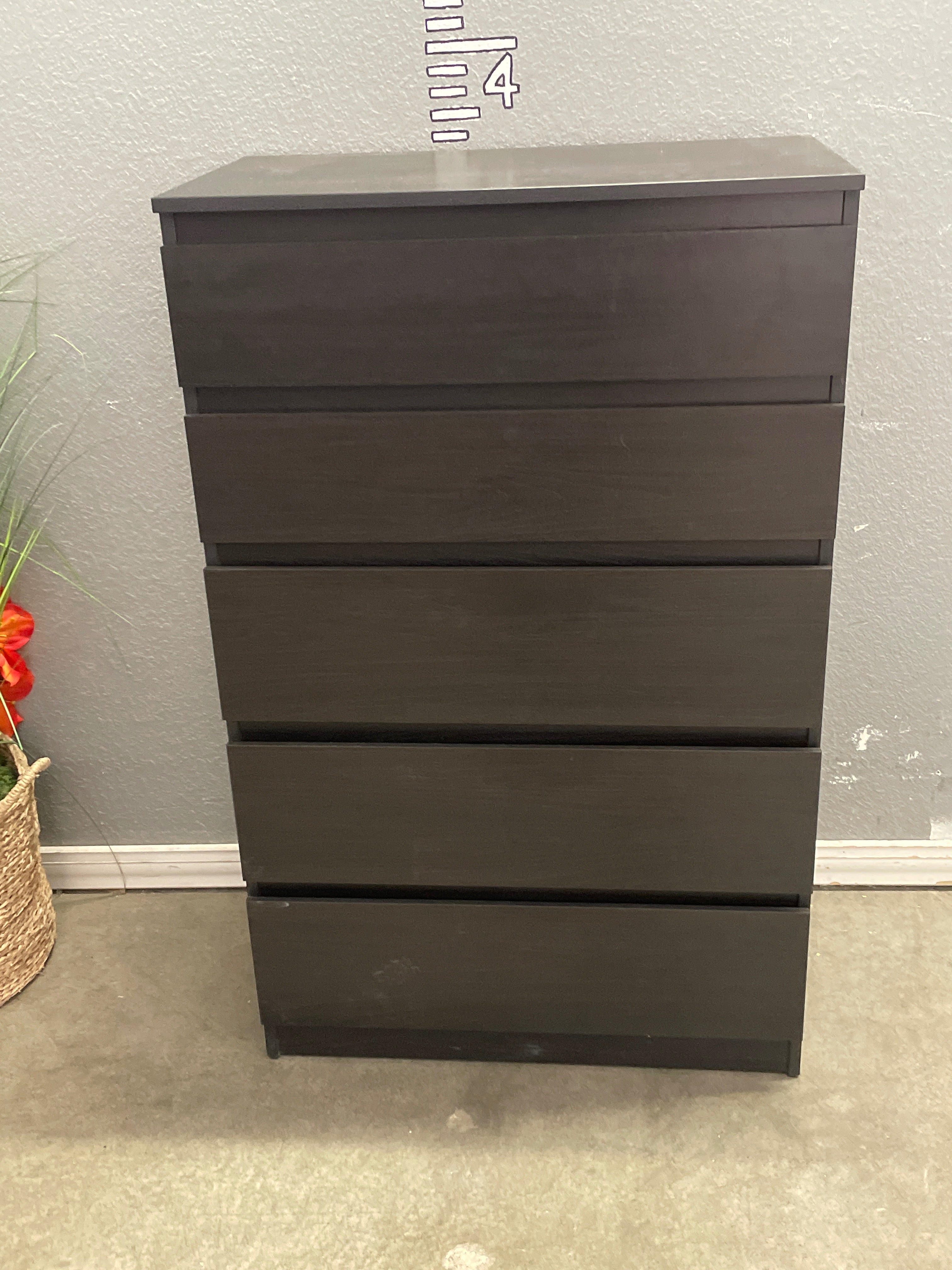 This sleek and modern 5-drawer chest features a dark wood finish, perfect for adding a touch of sophistication to any space. The matte finish complements its minimalist design, making it ideal for various decor styles. Approximate Size: 4.3 x 2.5 x 1.5