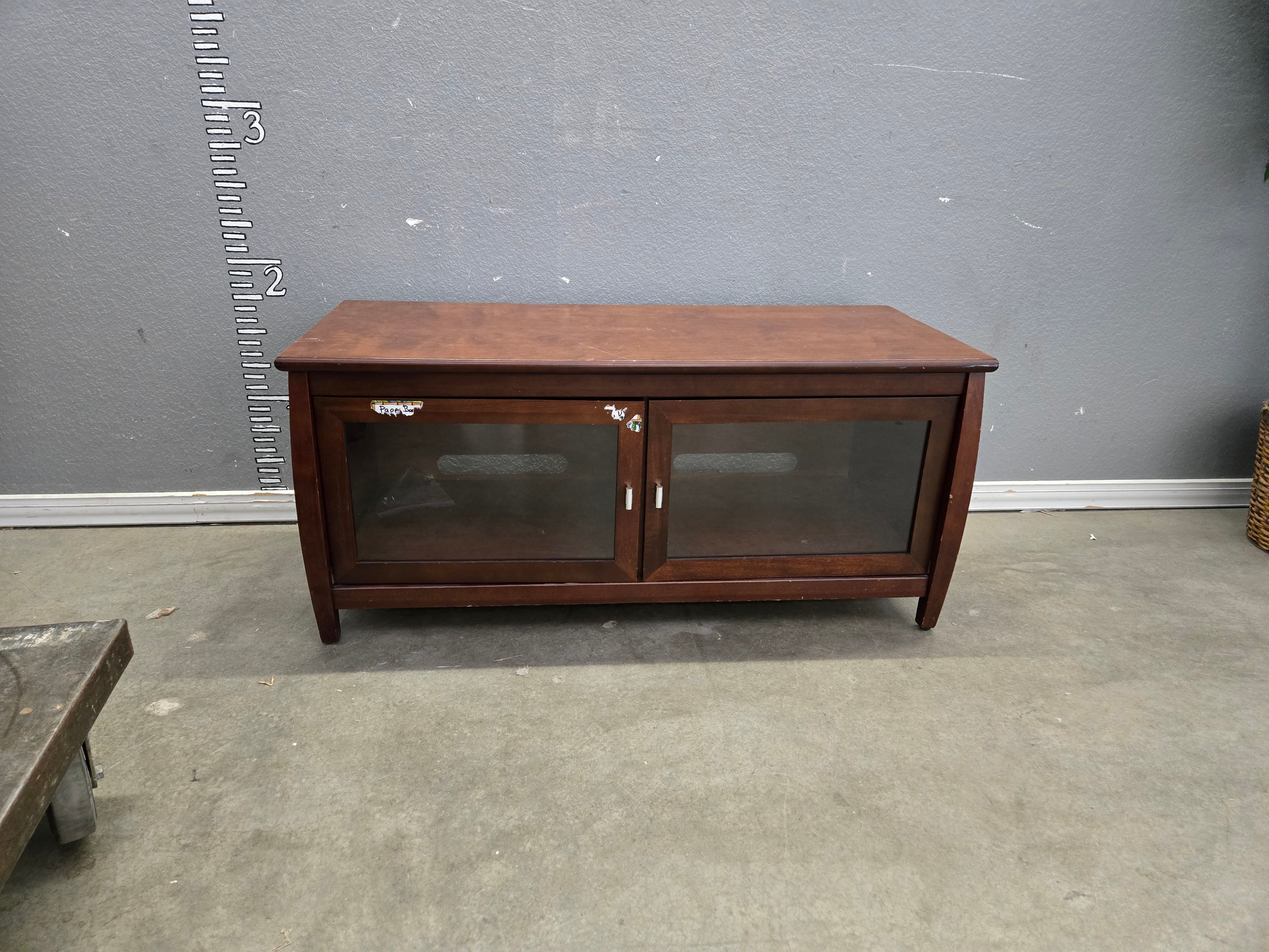 This vintage TV stand features a rich brown wood finish with glass panel doors providing a classic touch. Its sturdy construction and sleek design make it a perfect addition to any living room. Approximate Size: 1.6 x 3 x 1.5