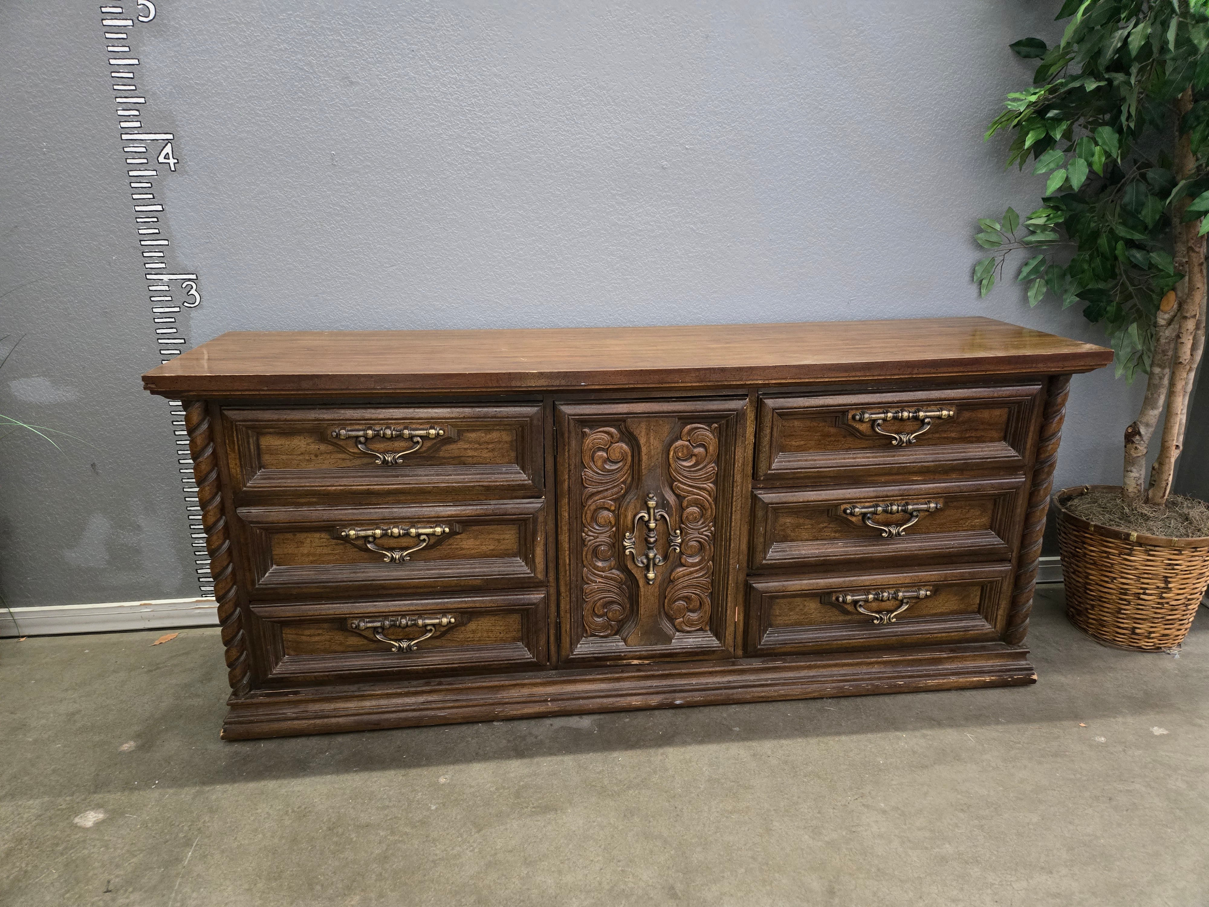 This elegant vintage dresser features a rich brown wood finish with intricate carvings on the central panels and ornate handles. The sturdy construction and classic design make it a timeless piece for any room. Approximate Size: 2.5 x 5.5 x 1.5