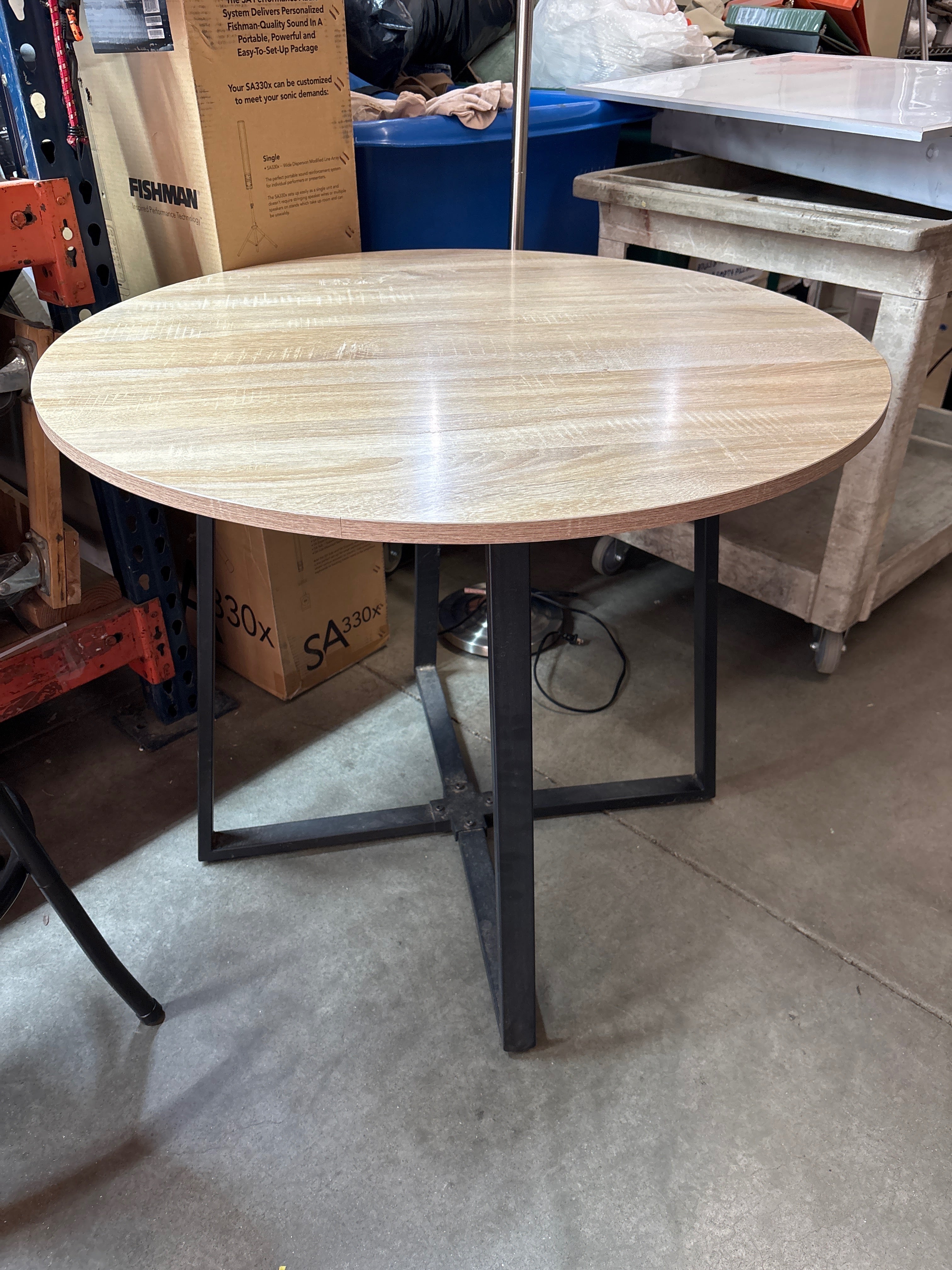 This round table features a light wood finish top combined with a sturdy black metal base. It's perfect for use in a variety of settings. Approximate Size: 2.5 x 3 x 3