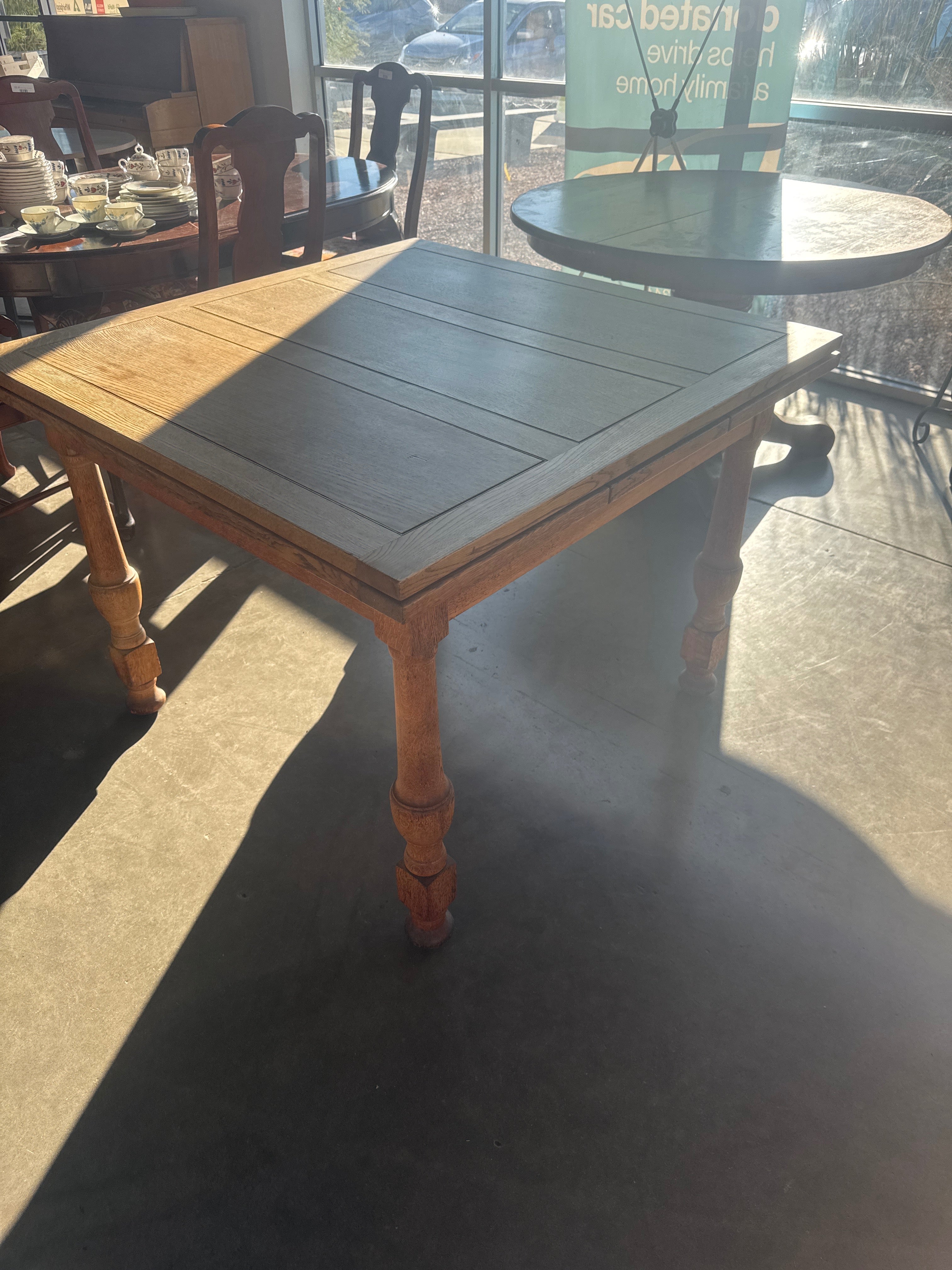 This charming vintage dining table features a natural wood finish with a rustic appeal. The wooden surface is seamlessly constructed, providing a classic and warm look perfect for any dining room setting. Approximate Size: 3 x 4 x 4