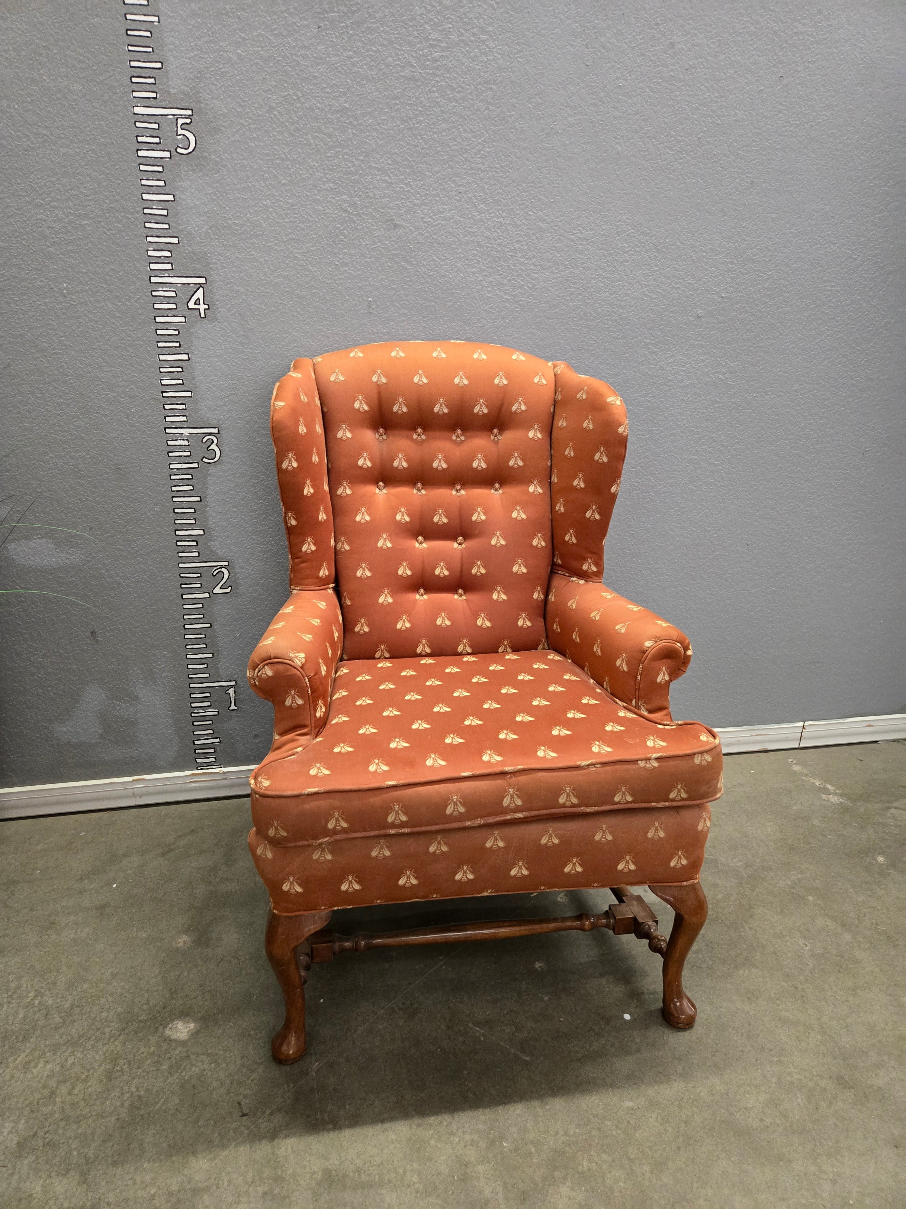 This classic vintage wingback armchair features a charming orange fabric with a subtle pattern, providing both style and comfort. The chair has a plush, cushioned seat and back, with wooden legs and a sturdy frame. Approximate Size: 4.5 x 2.5 x 2.5