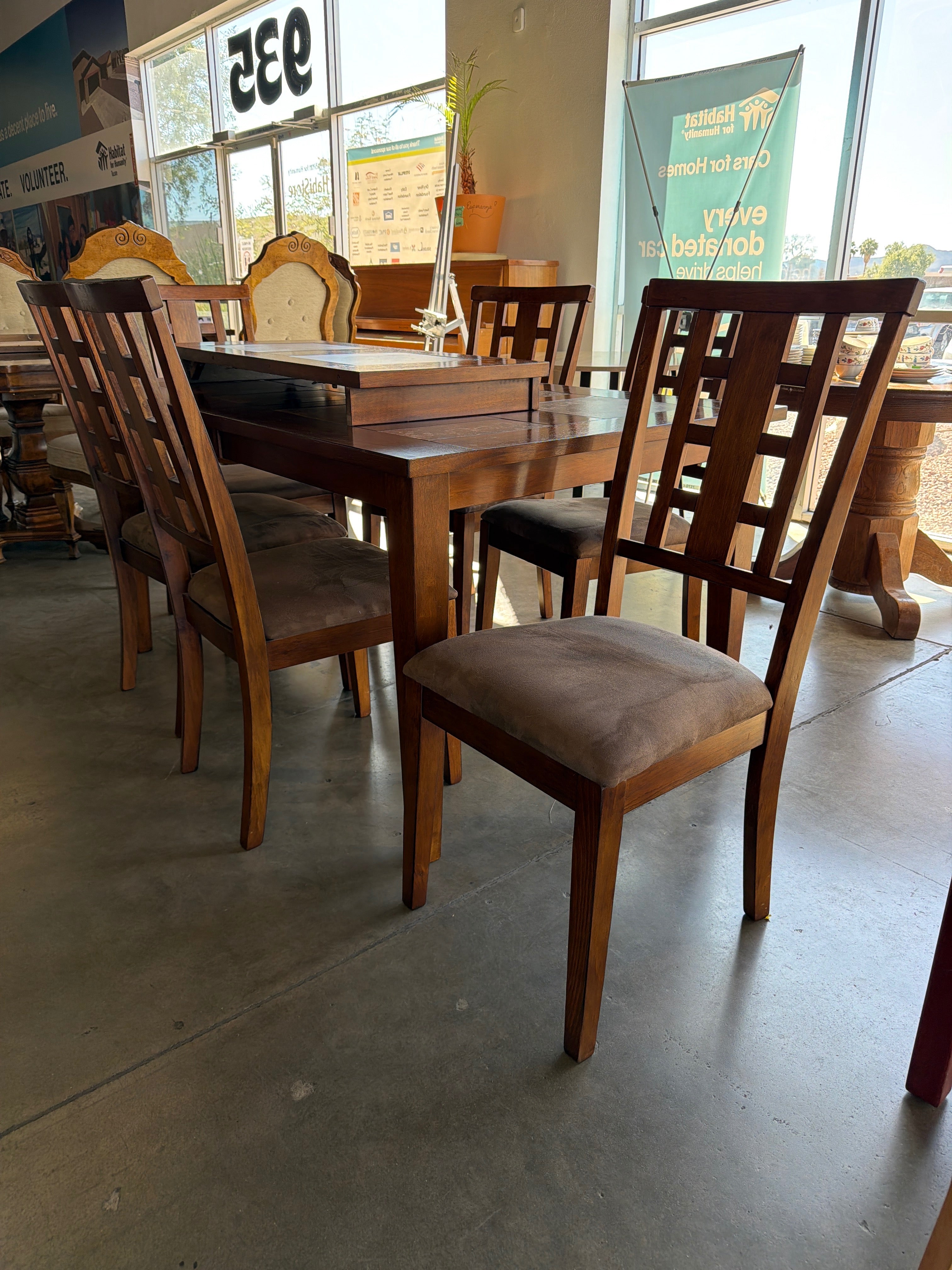 This elegant dining table set features a rich brown finish with cushioned chairs for enhanced comfort. The chairs are upholstered in a soft, fabric with a neutral tone, providing a sophisticated look suitable for any dining space. Approximate Size: 3 x 5 x 3