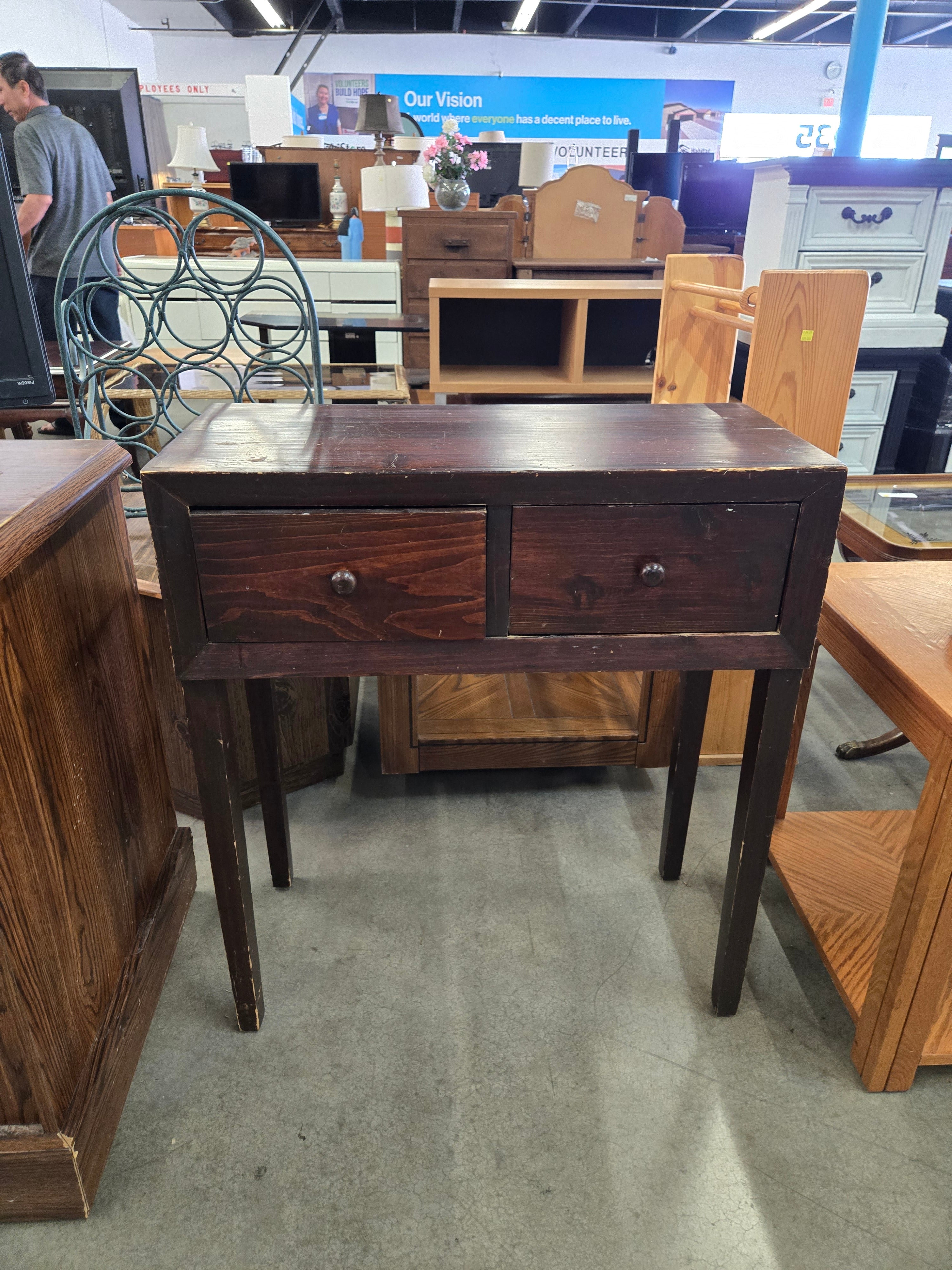 This elegant console table features a rich, dark brown wood finish, providing a vintage yet timeless appeal. It comes with two drawers, perfect for additional storage in your living space. Approximate Size: 3 x 3 x 1