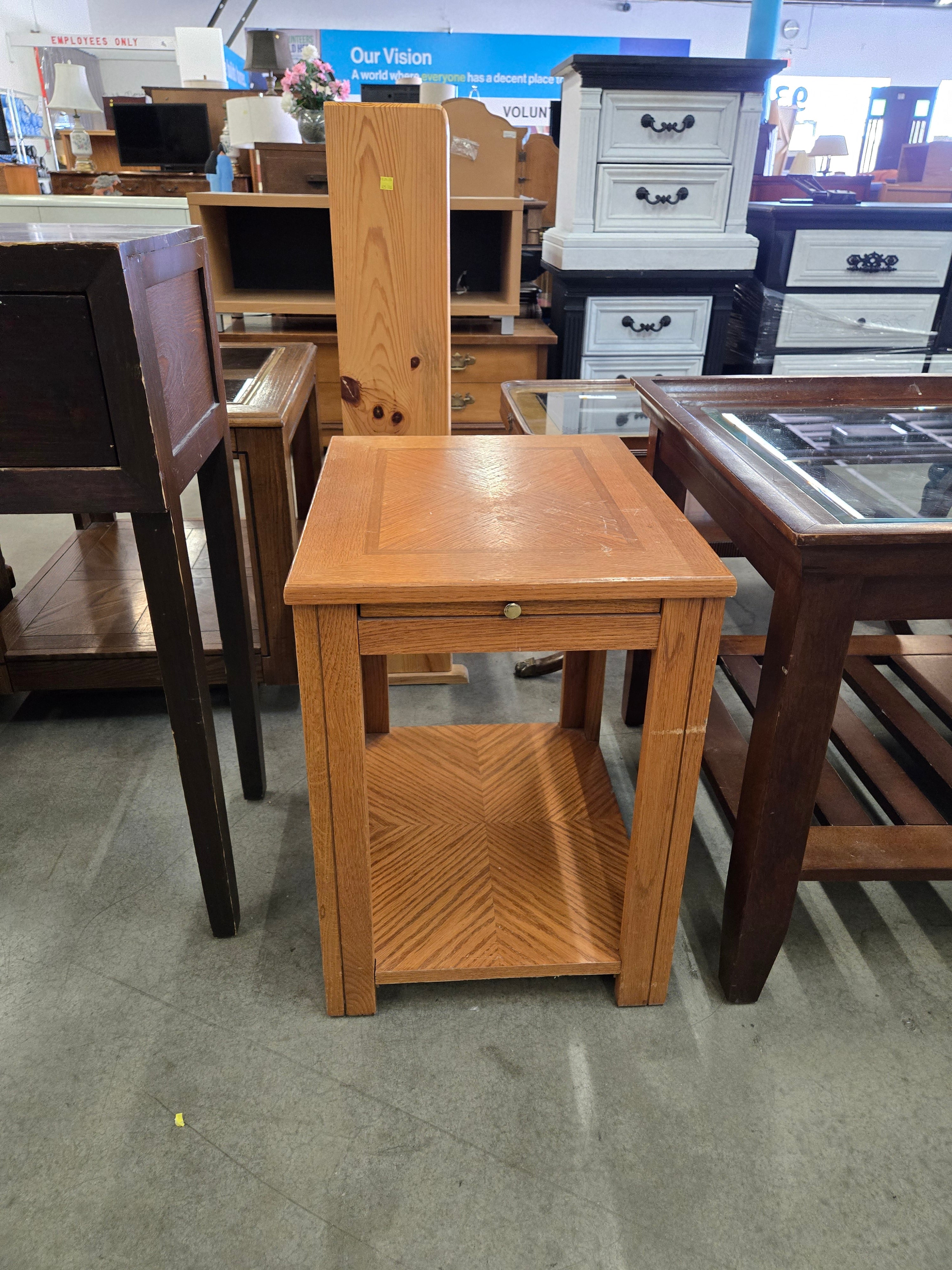 This elegant side table features a warm oak finish with a beautiful wood grain pattern. It's crafted from solid wood, offering both durability and style. Approximate Size: 2.5 x 1.5 x 1.5