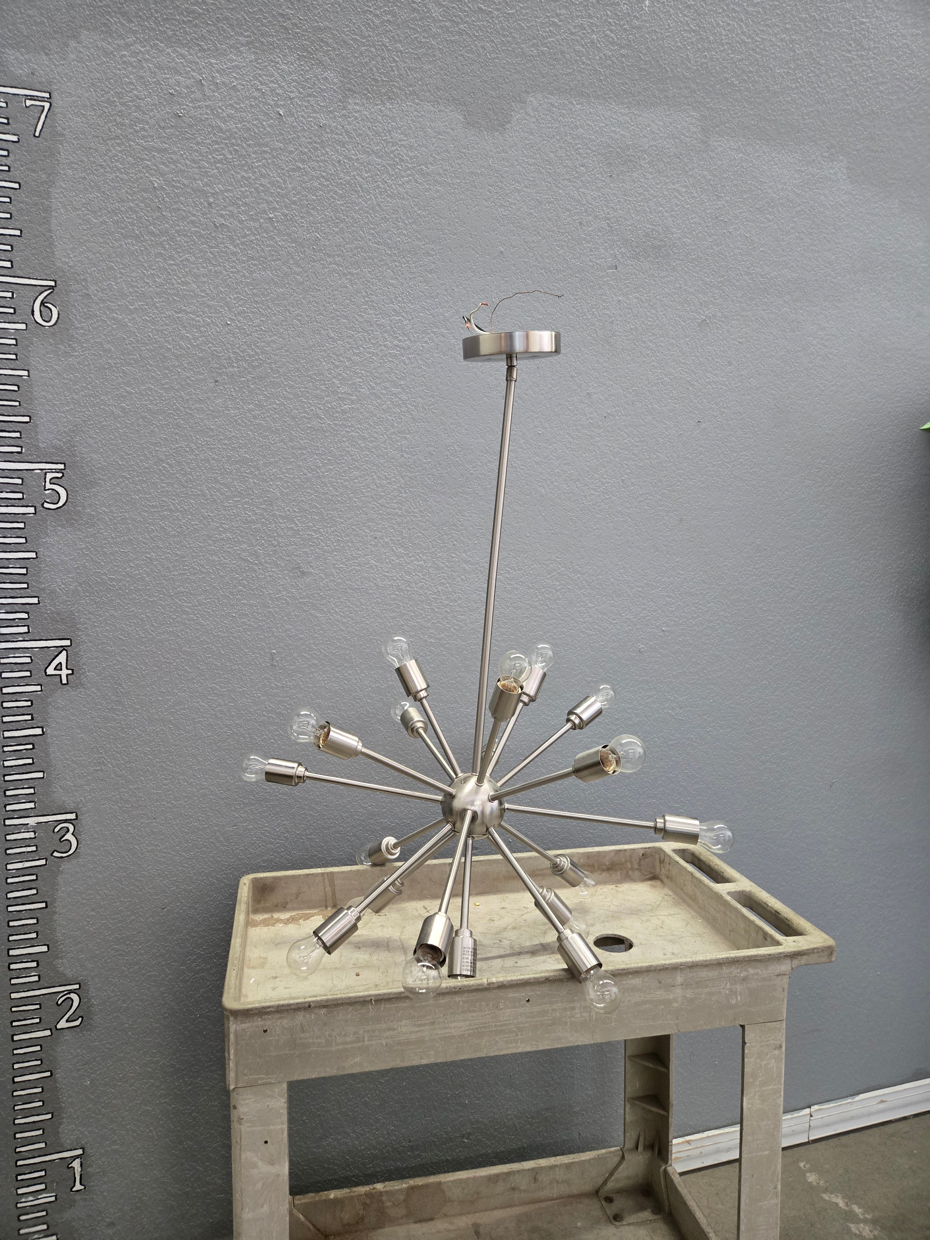 This eye-catching chandelier features a sleek, brushed nickel finish, perfect for adding a contemporary touch to any space. The fixture's sputnik design highlights twelve arms radiating from a central sphere, each holding a light bulb that enhances its modern appeal. Approximate Size: 2 x 1.5 x 1.5