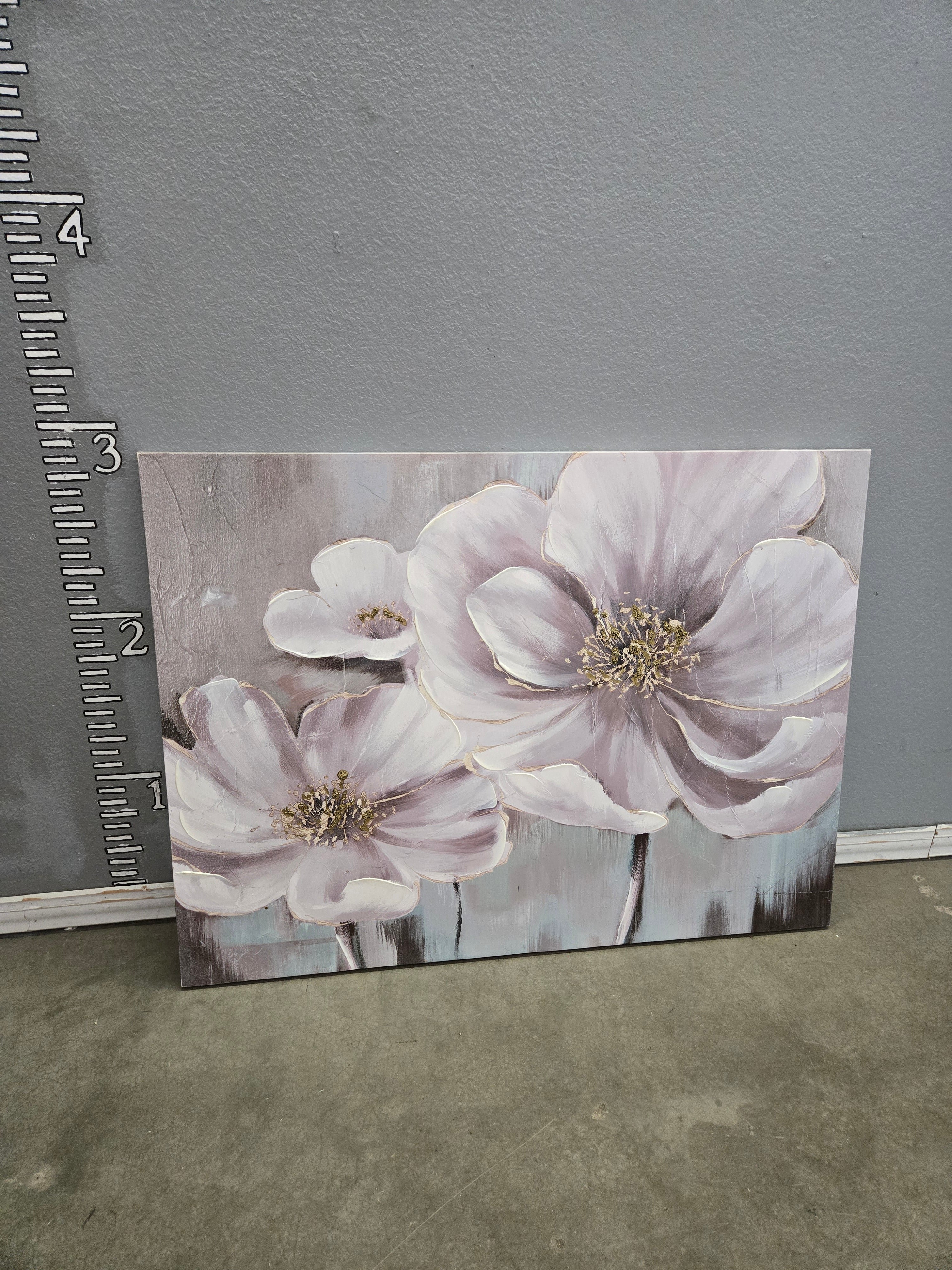 This elegant canvas wall art features beautiful large white flowers set against a muted gray and blue background. The subtle colors and textured finish make it a perfect addition to any modern living space. Approximate Size: 2.5 x 2 x 0.1