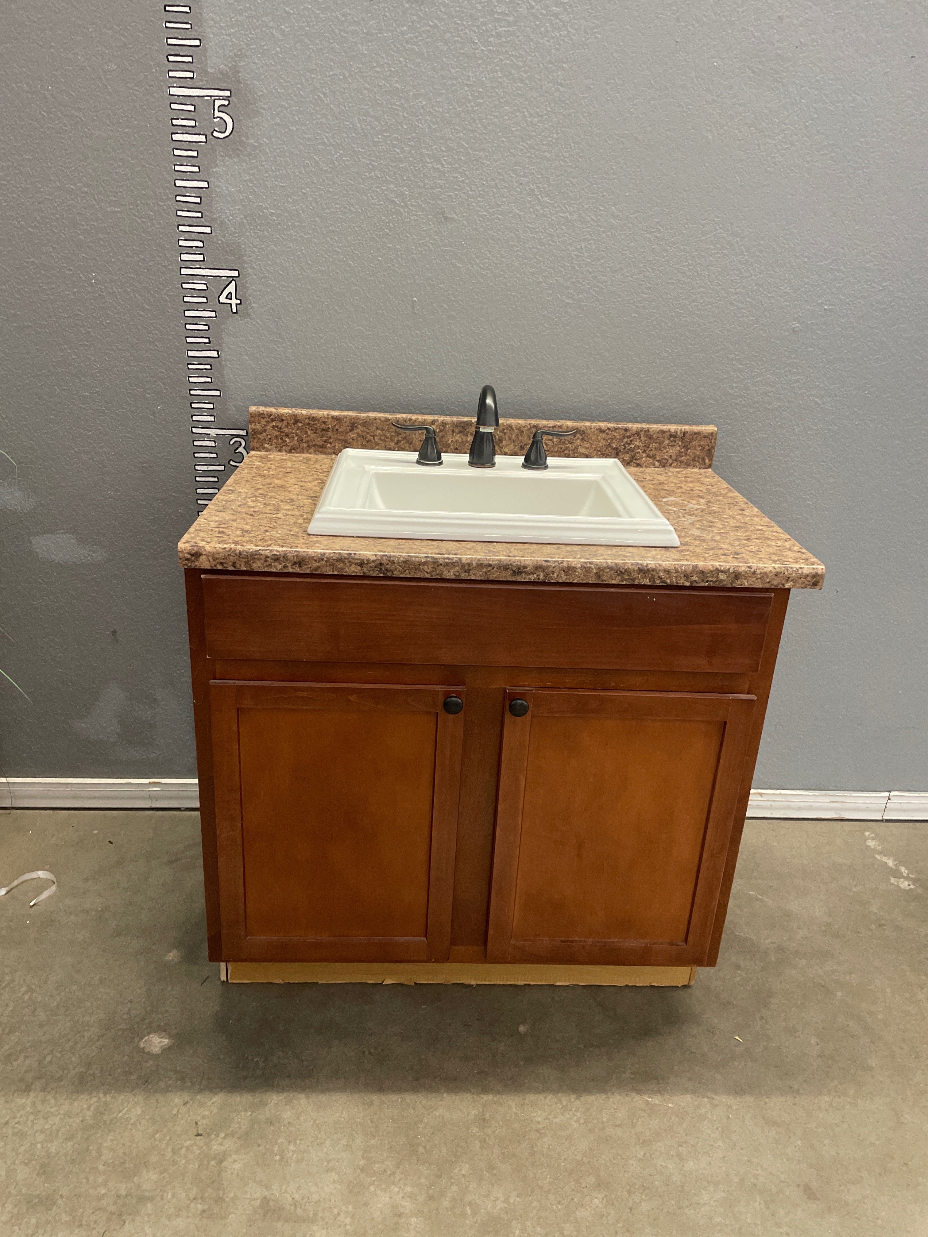 This elegant bathroom vanity features a rich, warm wood finish with a marble laminate countertop. The integrated ceramic sink adds a touch of sophistication, making it perfect for a modern bathroom setting. Approximate Size: 3.5 x 2.5 x 1.5