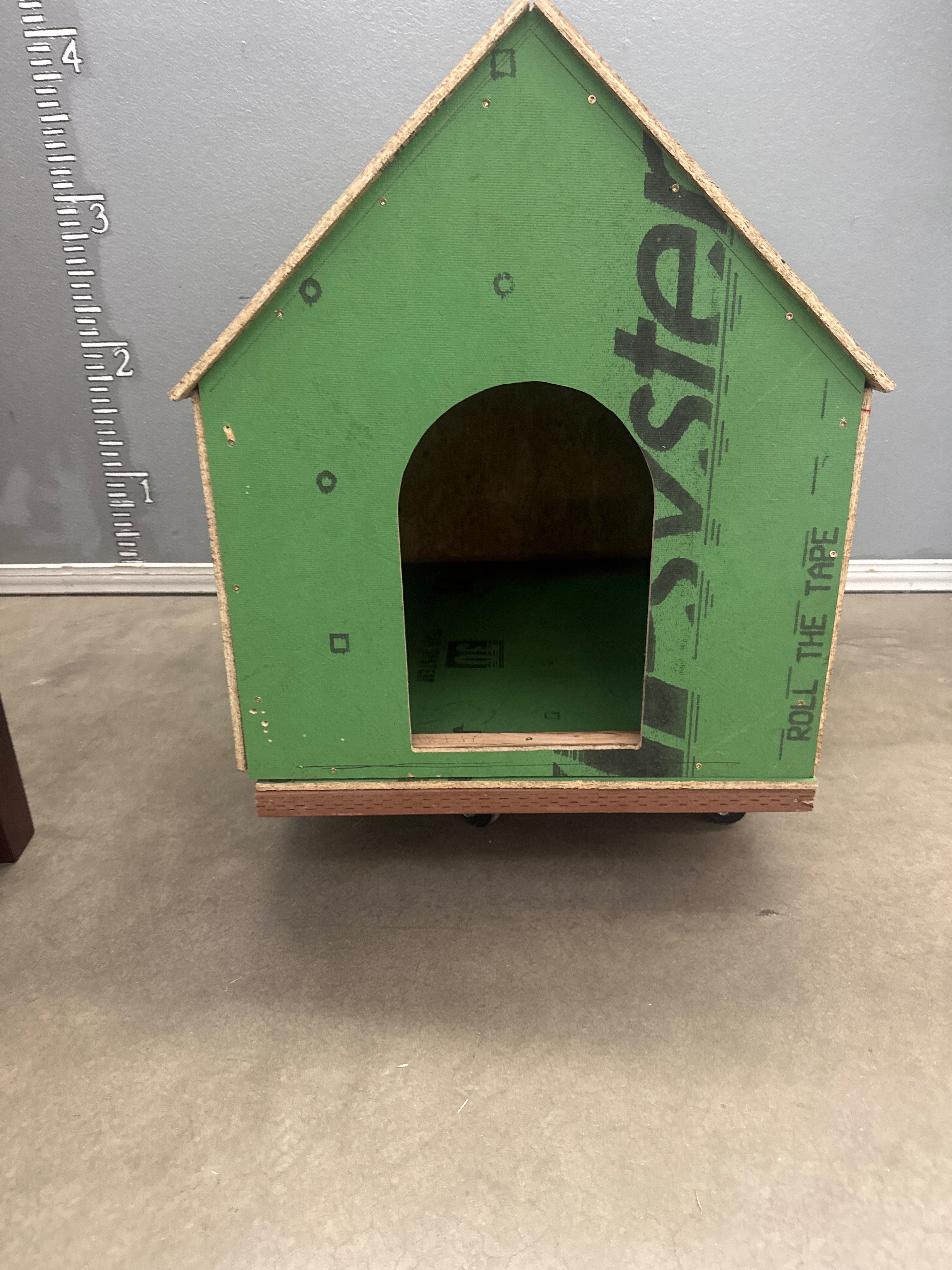 This sturdy dog house is made from composite wood boards in a natural wood and green finish. Its portable design features wheels for easy relocation, and the rustic look adds charm to any outdoor space. Approximate Size: 3 x 2 x 2