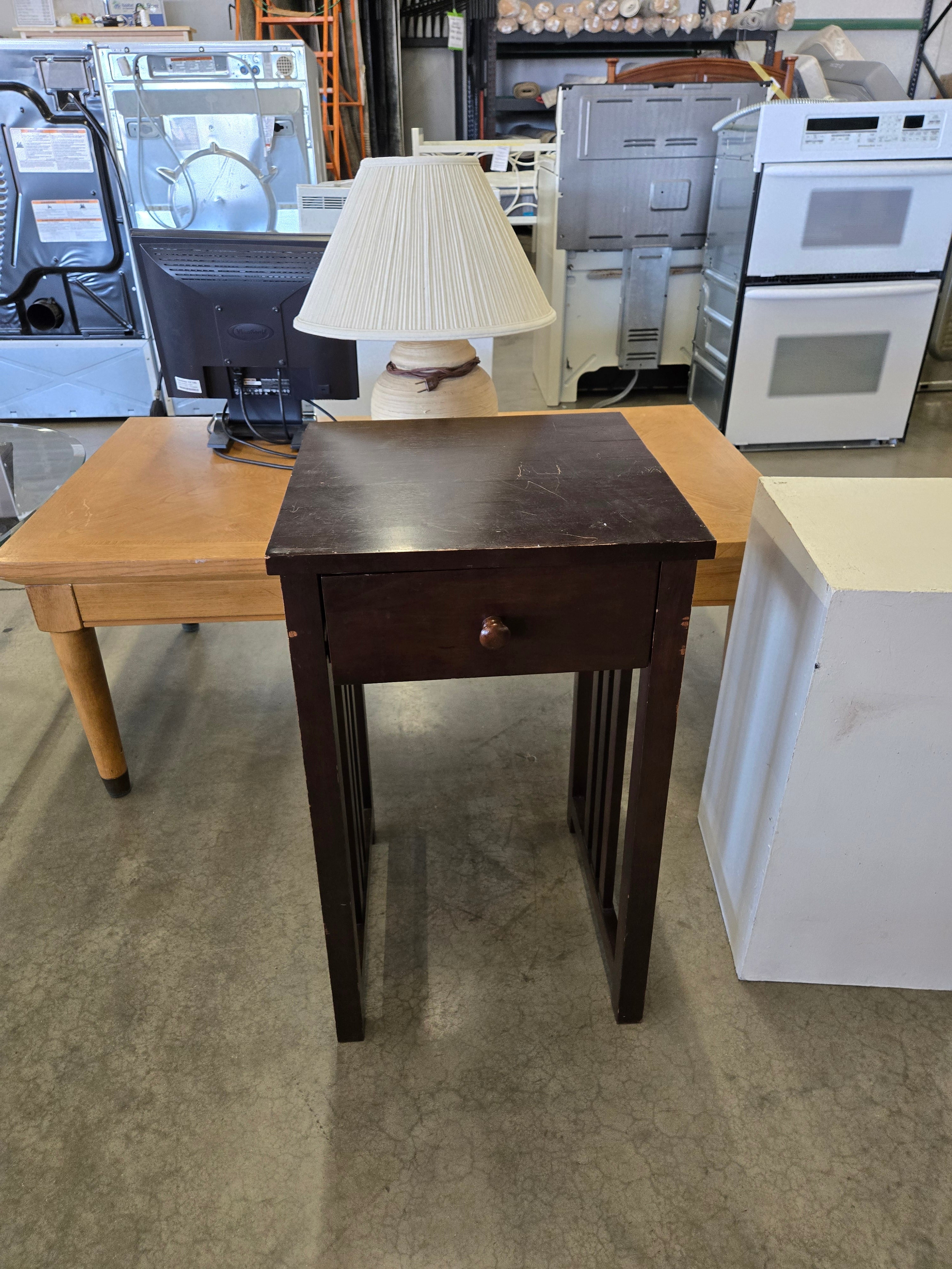 This elegant side table features a rich dark wood finish, adding a touch of sophistication to any living space. It includes a functional drawer for convenient storage. Approximate Size: 2.5 x 1.5 x 1.5