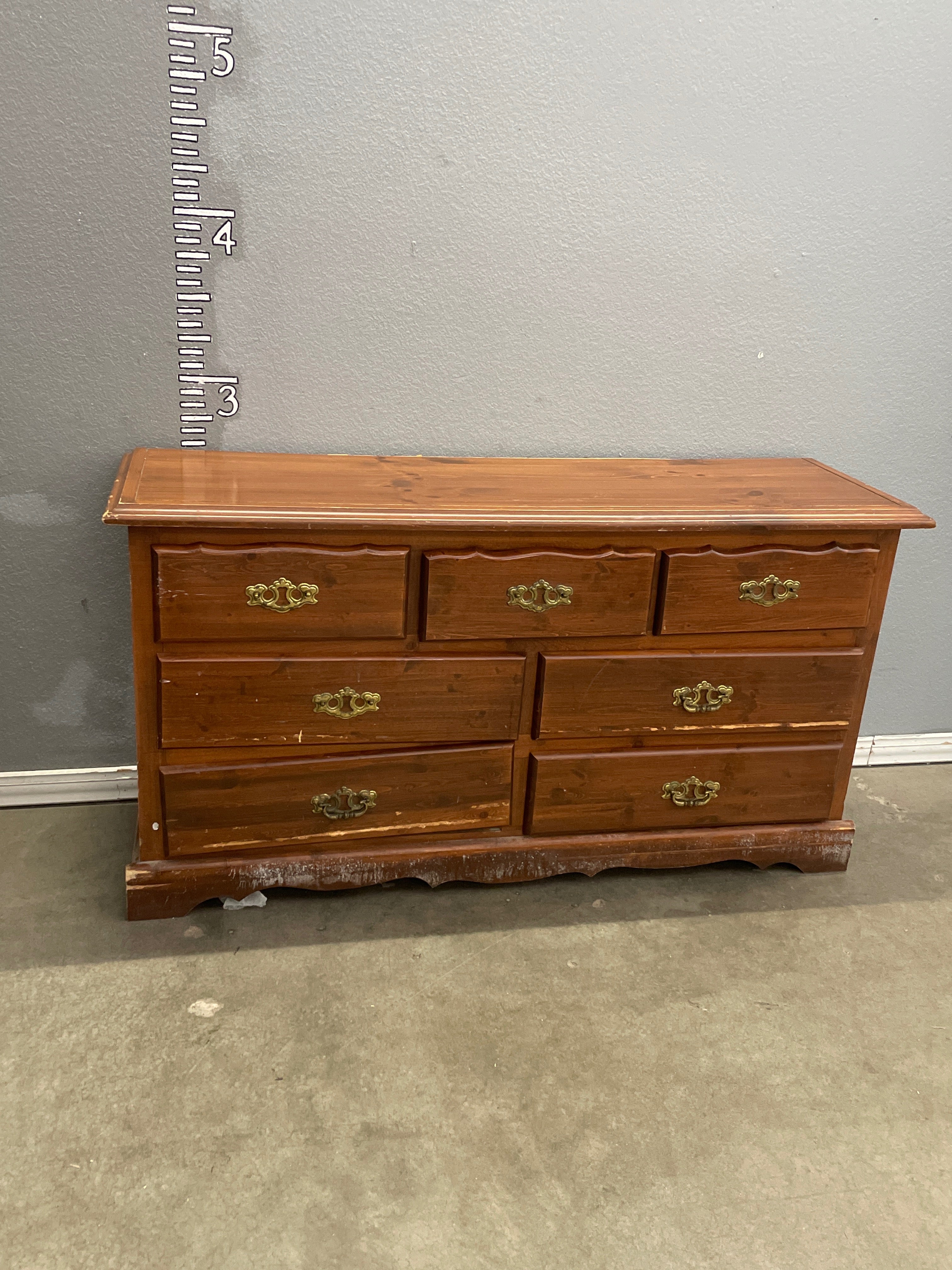 This classic dresser features a warm brown finish with a slightly distressed wood texture, complemented by ornate brass handles. Perfect for adding a touch of vintage charm to any bedroom. Approximate Size: 3 x 4.5 x 1.5