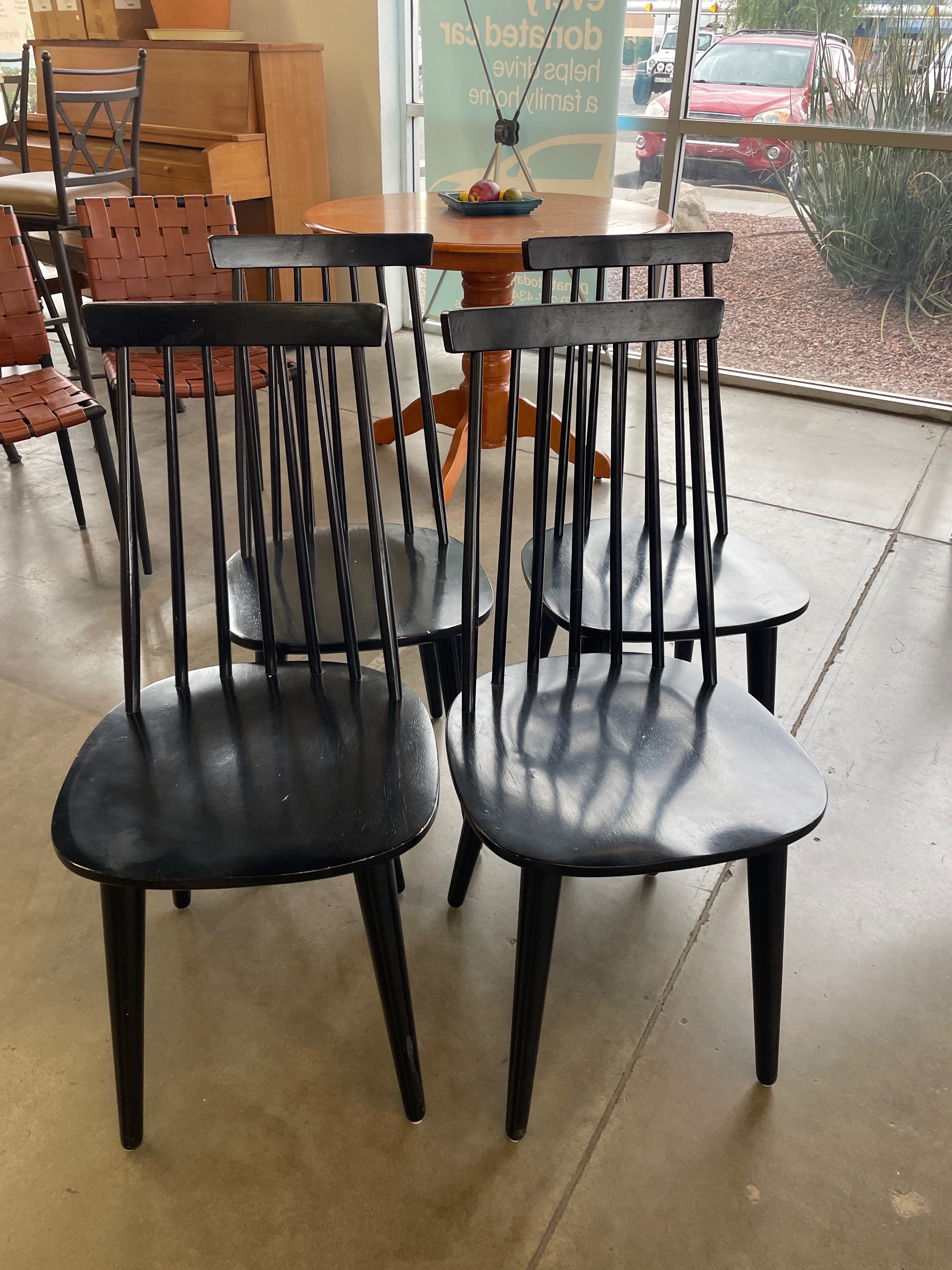 This elegant set of four dining chairs features a sleek black finish with a minimalist design. The wooden construction provides durability and a timeless look, perfect for any dining room decor. Approximate Size: 3 x 1.5 x 1.5