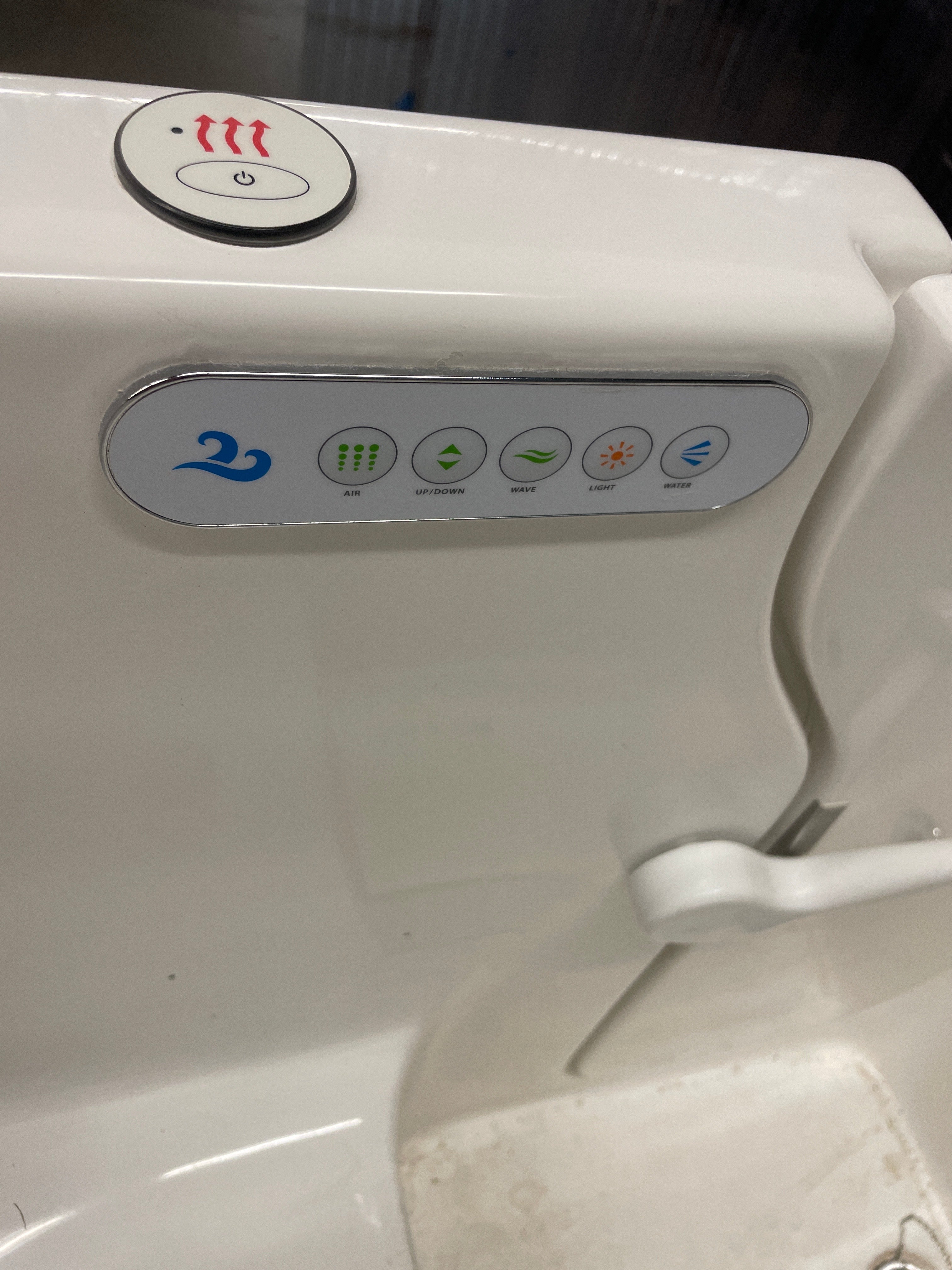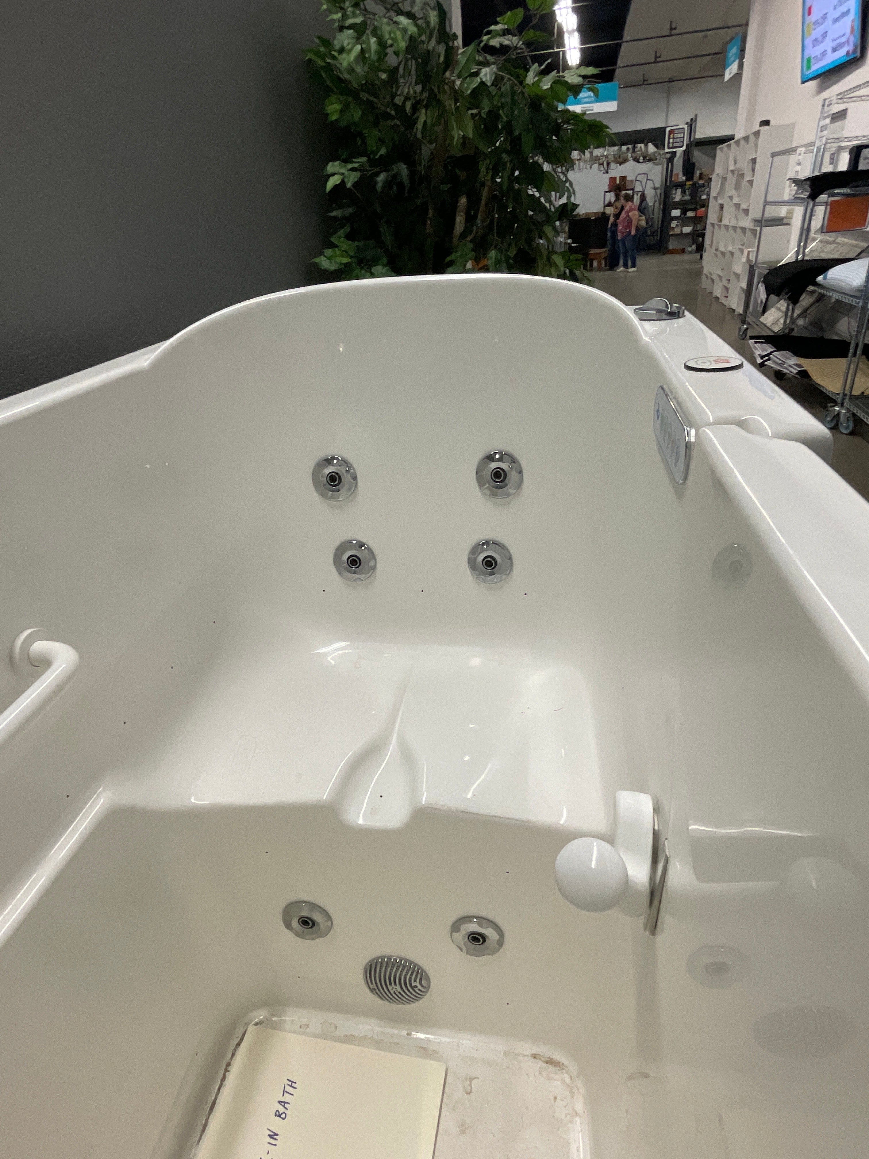 This white walk-in bathtub features a smooth finish and includes a convenient door for easy access. Ideal for ensuring safety and comfort while bathing, it is perfect for those who require additional support and assistance. The tub includes a chrome faucet and shower attachment. Approximate Size: 3 x 4.5 x 2
