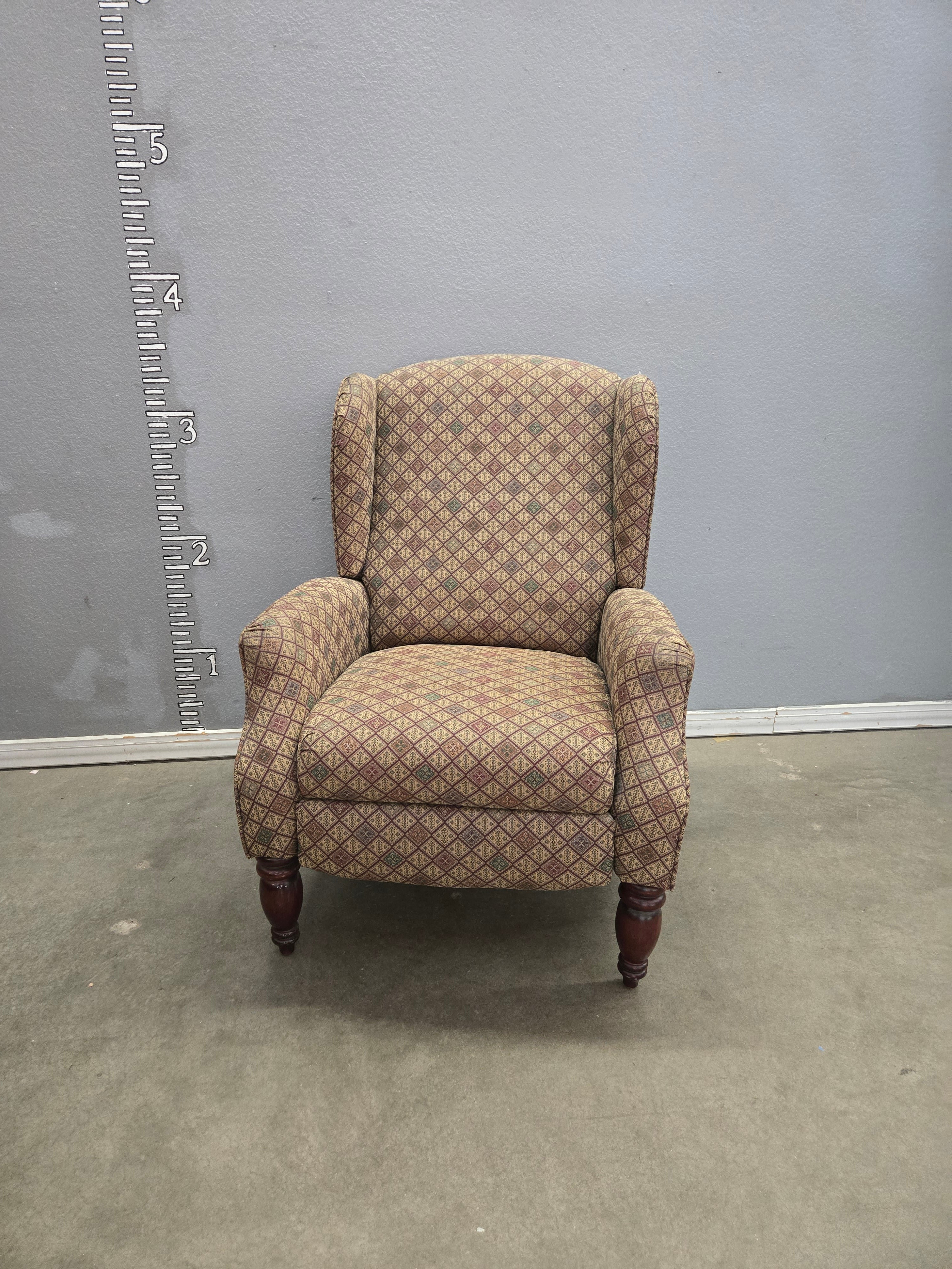 A classic wingback armchair upholstered in a patterned fabric of muted reds and golds, featuring a soft, textured finish. The chair stands on sturdy, turned wooden legs, adding a touch of elegance to any space. Approximate Size: 3.5 x 2.5 x 2.5