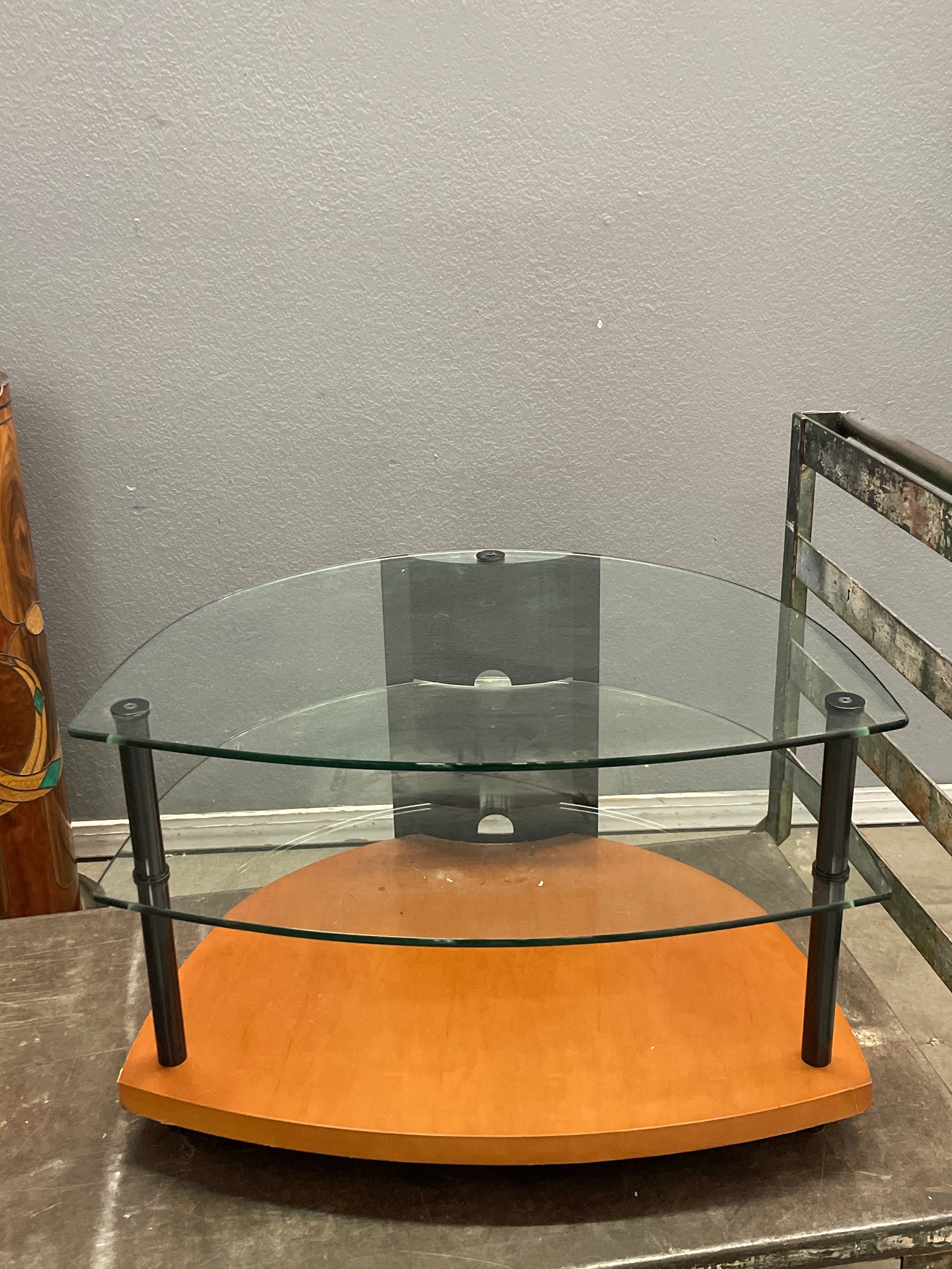 This contemporary TV stand features a sleek glass and wood design. It has a clear glass finish with a warm wood base, providing an elegant and modern touch to any living room setting. Approximate Size: 2 x 3 x 1.5