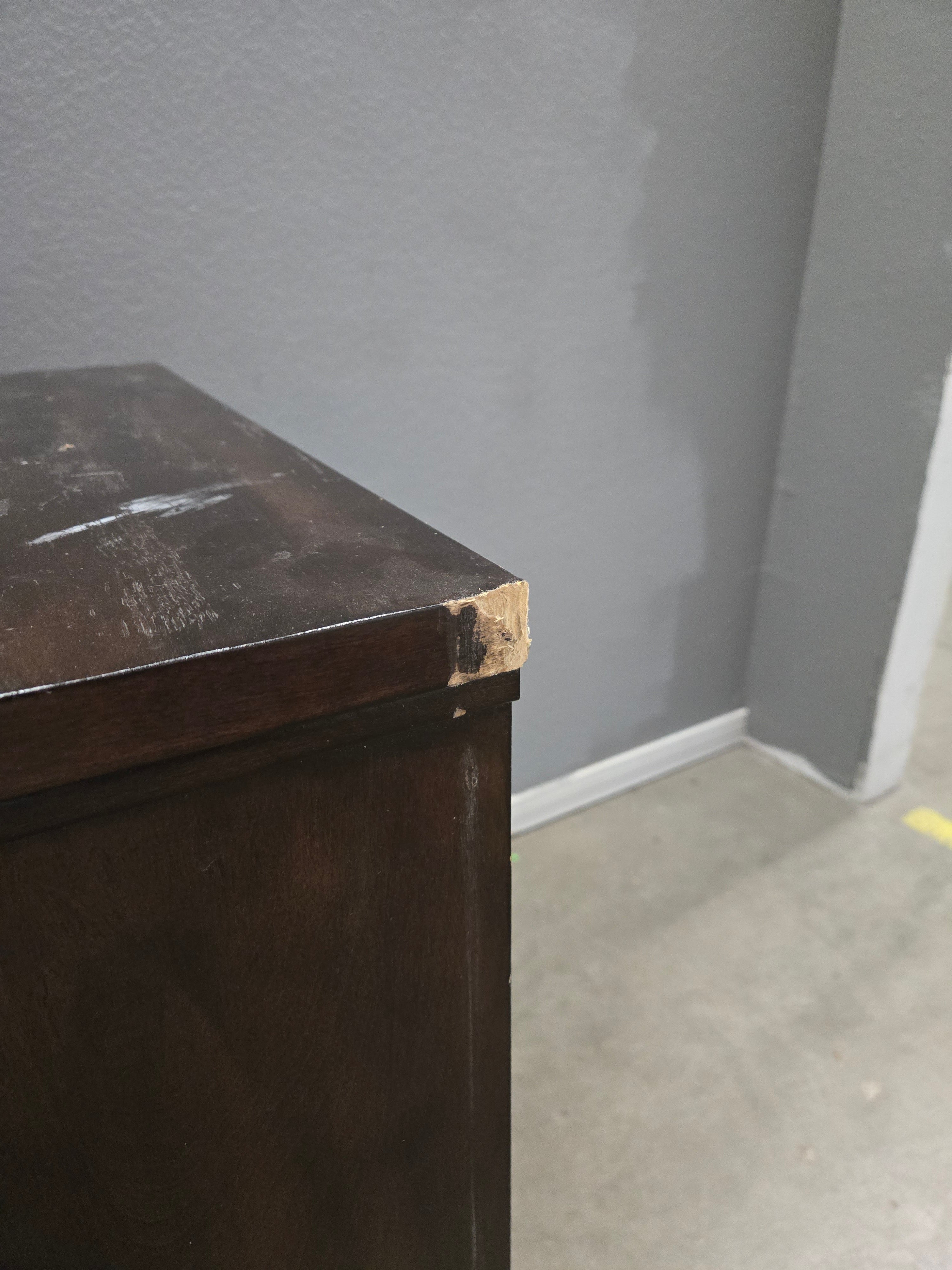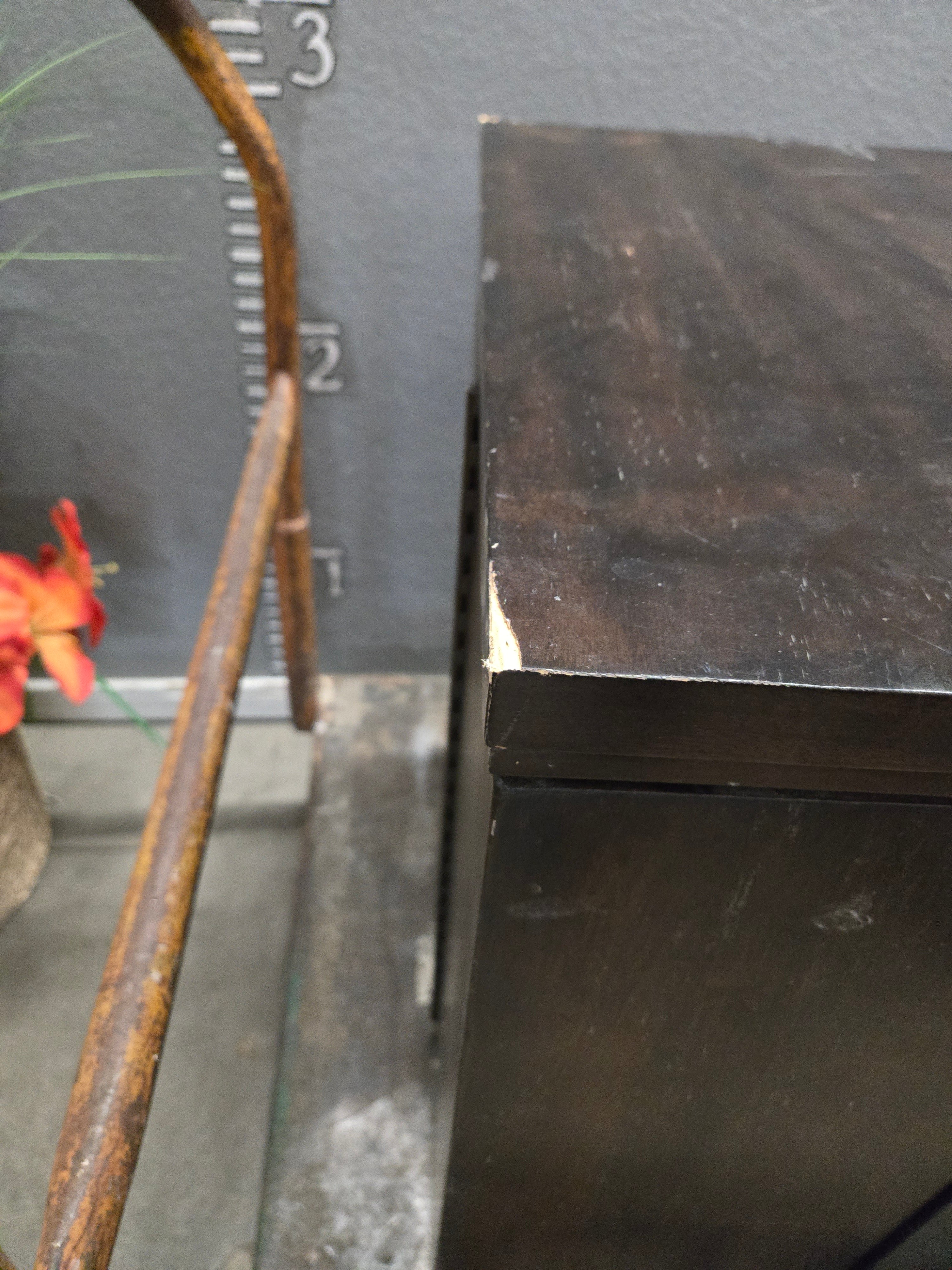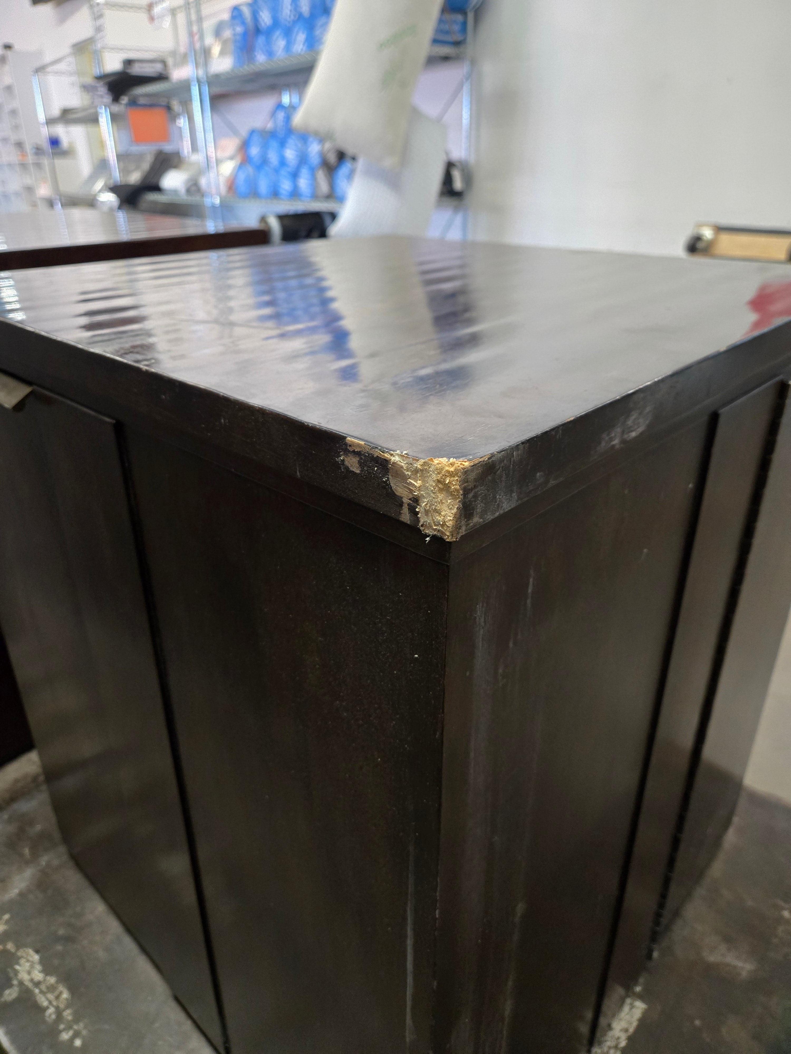 This pair of vintage cabinets features a rich dark wood finish. Their sleek and classic design is ideal for adding a touch of elegance to any space. Each cabinet has a smooth surface and brass handles, perfect for storage or use as end tables. Approximate Size: 2.5 x 1.5 x 1.5