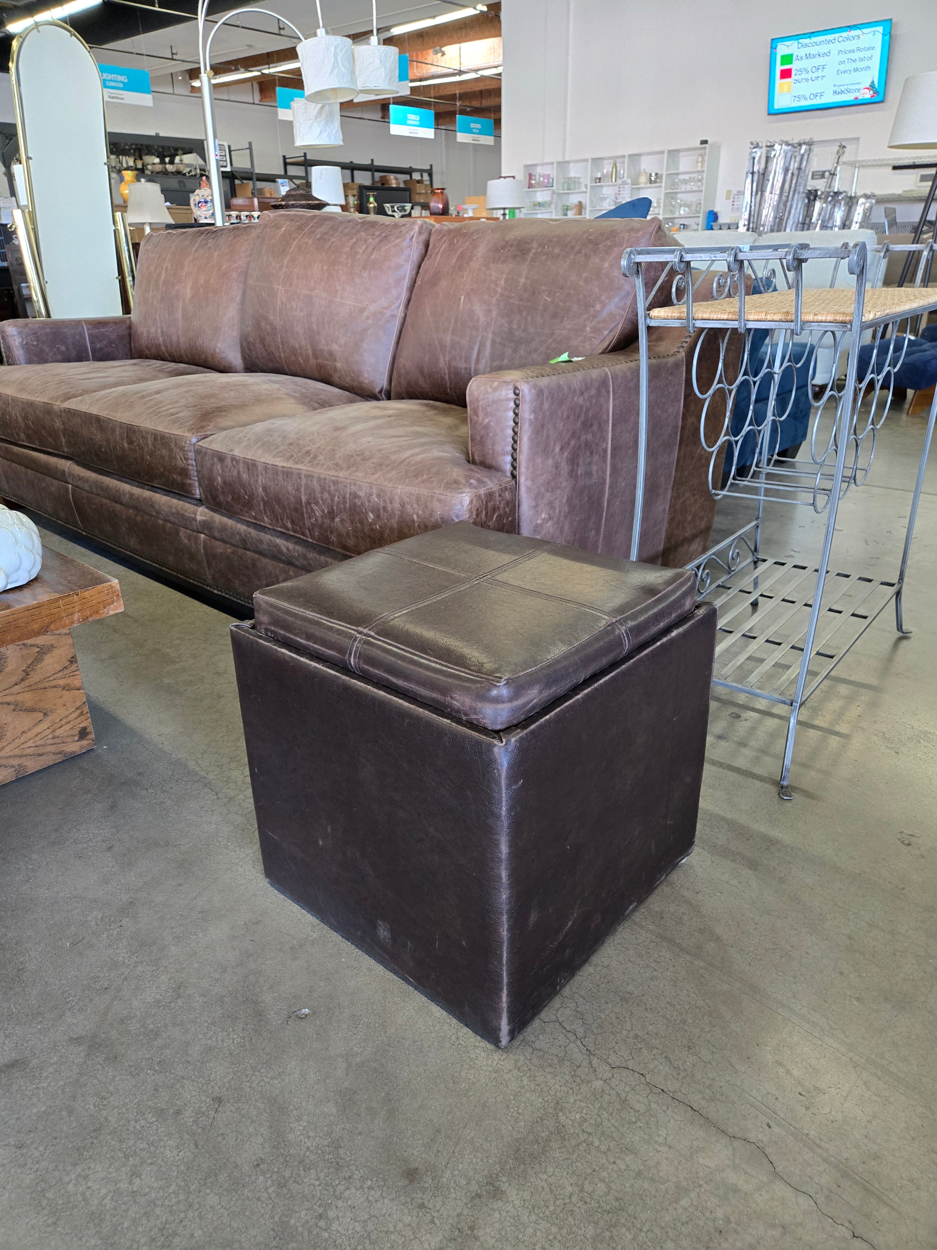 This stylish ottoman features a rich brown leather finish, providing a classic touch to any living room. The functional design includes convenient storage space beneath the removable lid, perfect for keeping your space organized. Approximate Size: 2 x 1.5 x 1.5