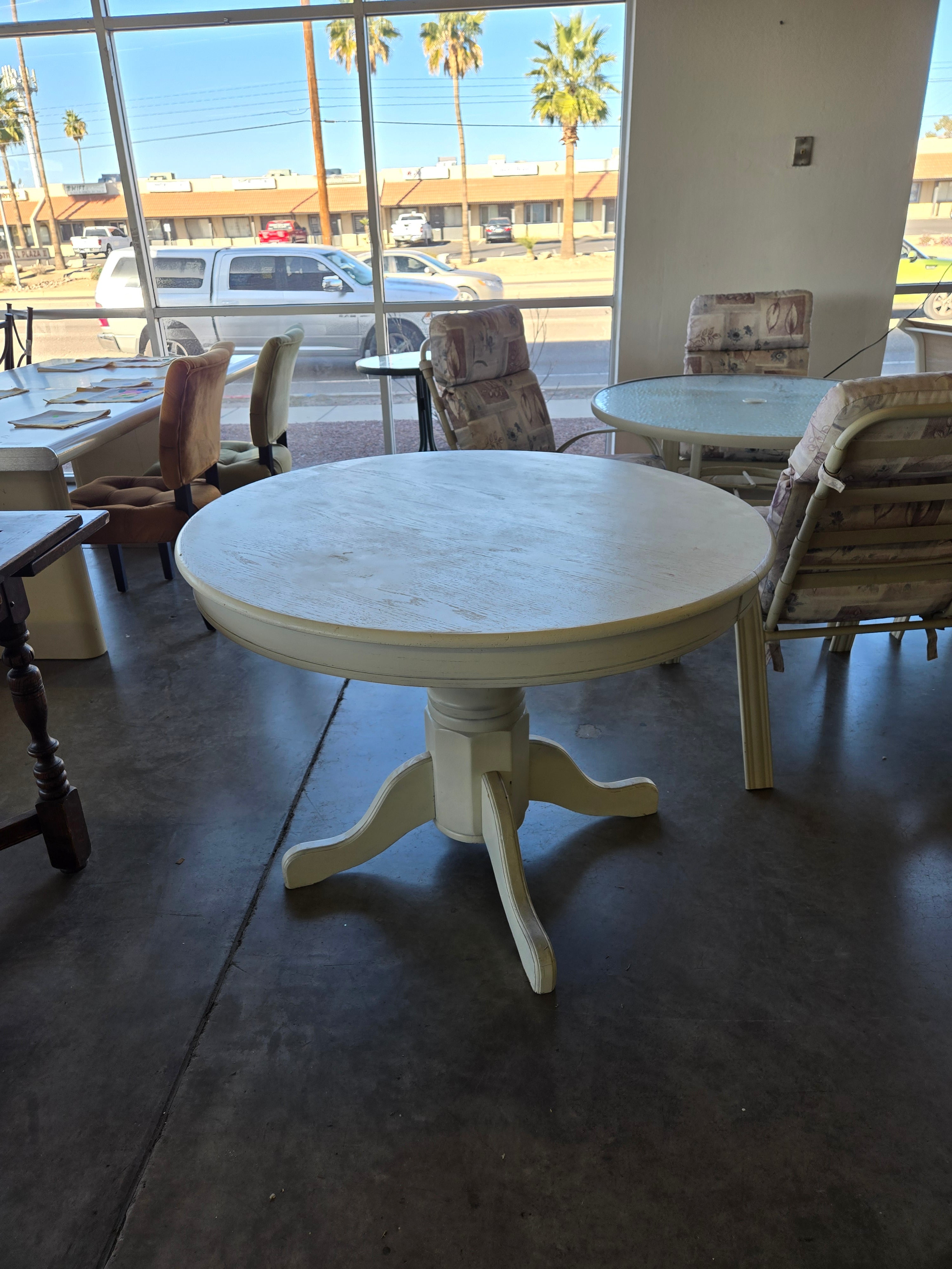 This charming dining table features a classic round design with a distressed white finish, perfect for adding a touch of rustic elegance to any dining room. Approximate Size: 2.5 x 4 x 4