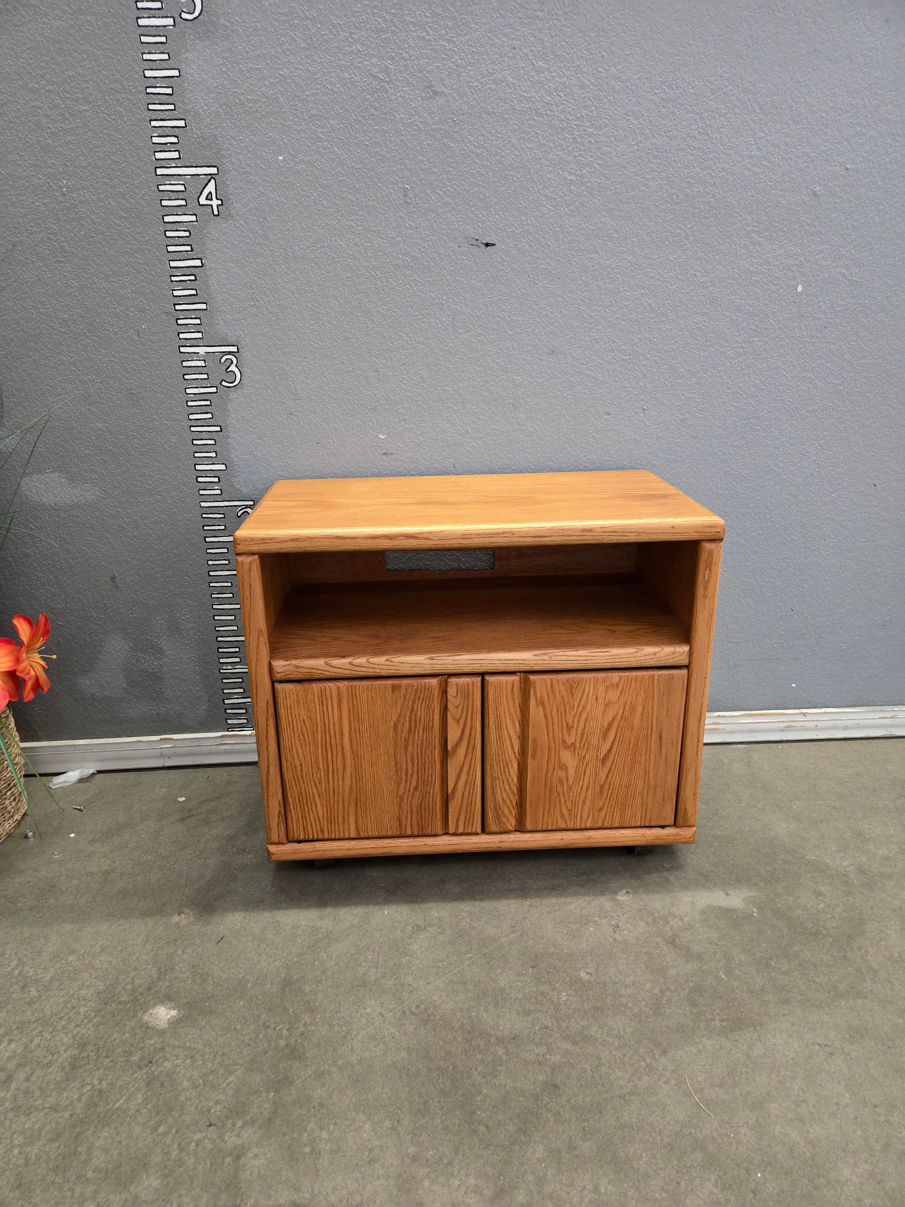This sturdy oak wood cabinet boasts a natural wood finish, offering a warm and classic look. It features a spacious open shelf on top and a closed compartment with doors below, perfect for organizing your living space. Approximate Size: 3 x 2.5 x 1.5