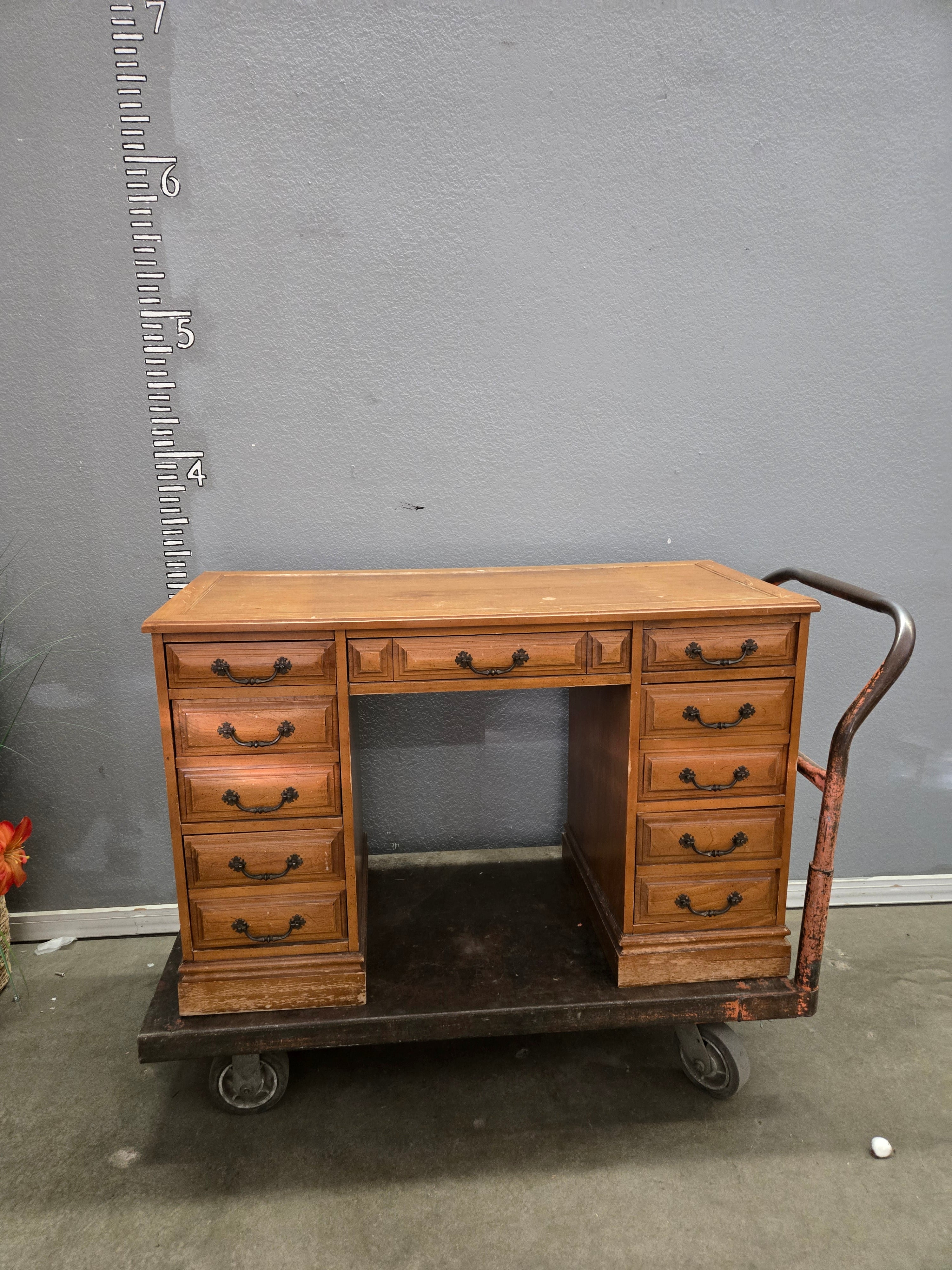 This classic office desk features a rich brown wood finish with an attractive vintage patina. It includes multiple drawers for optimal storage and elegant metal handles that enhance its traditional aesthetic. Approximate Size: 3 x 4 x 2