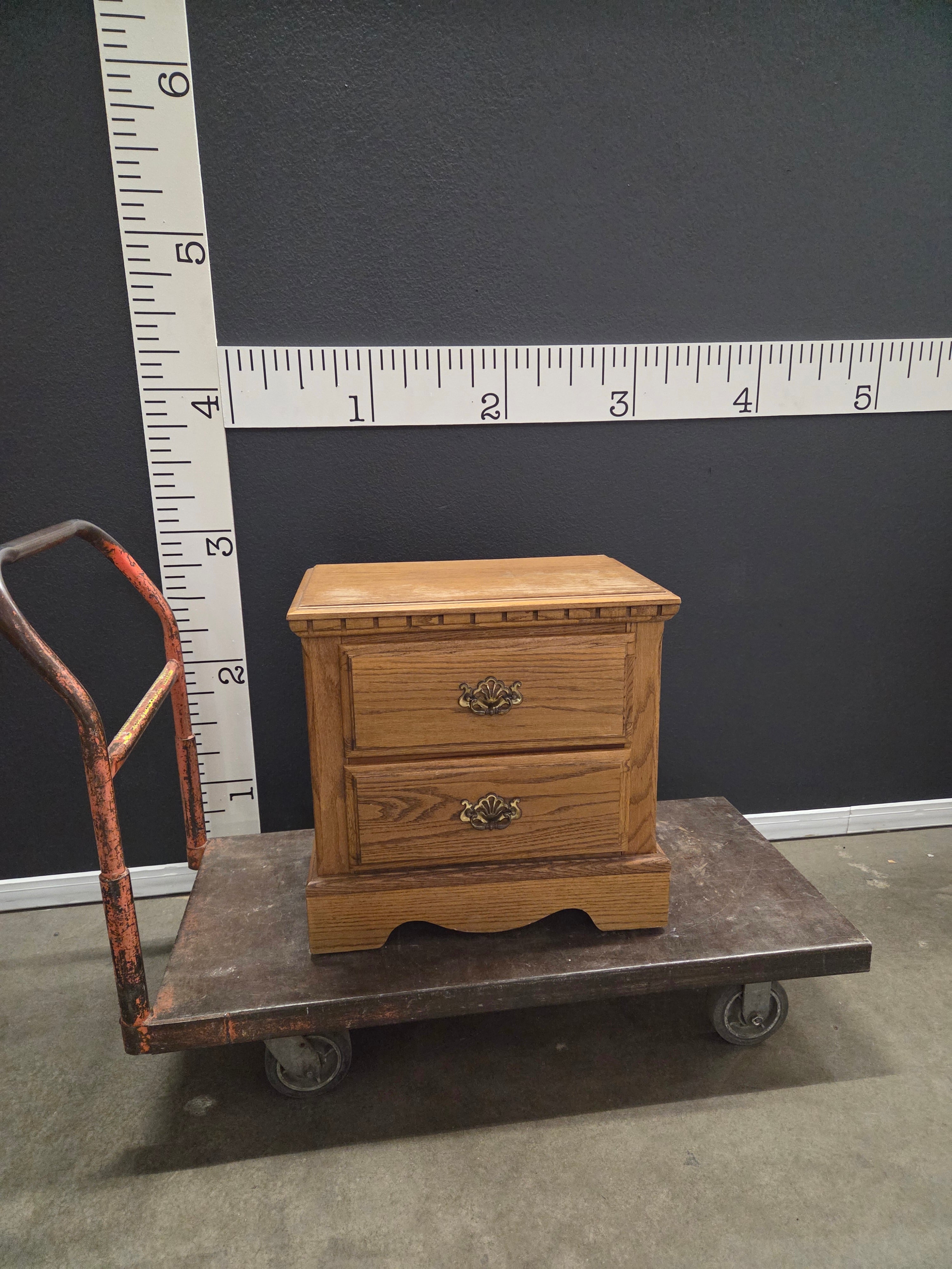 This classic vintage nightstand features a warm oak finish with two ornate brass handles. Its compact size makes it ideal for any bedroom setting, while the sturdy wood construction ensures durability. Approximate Size: 2 x 1.5 x 1