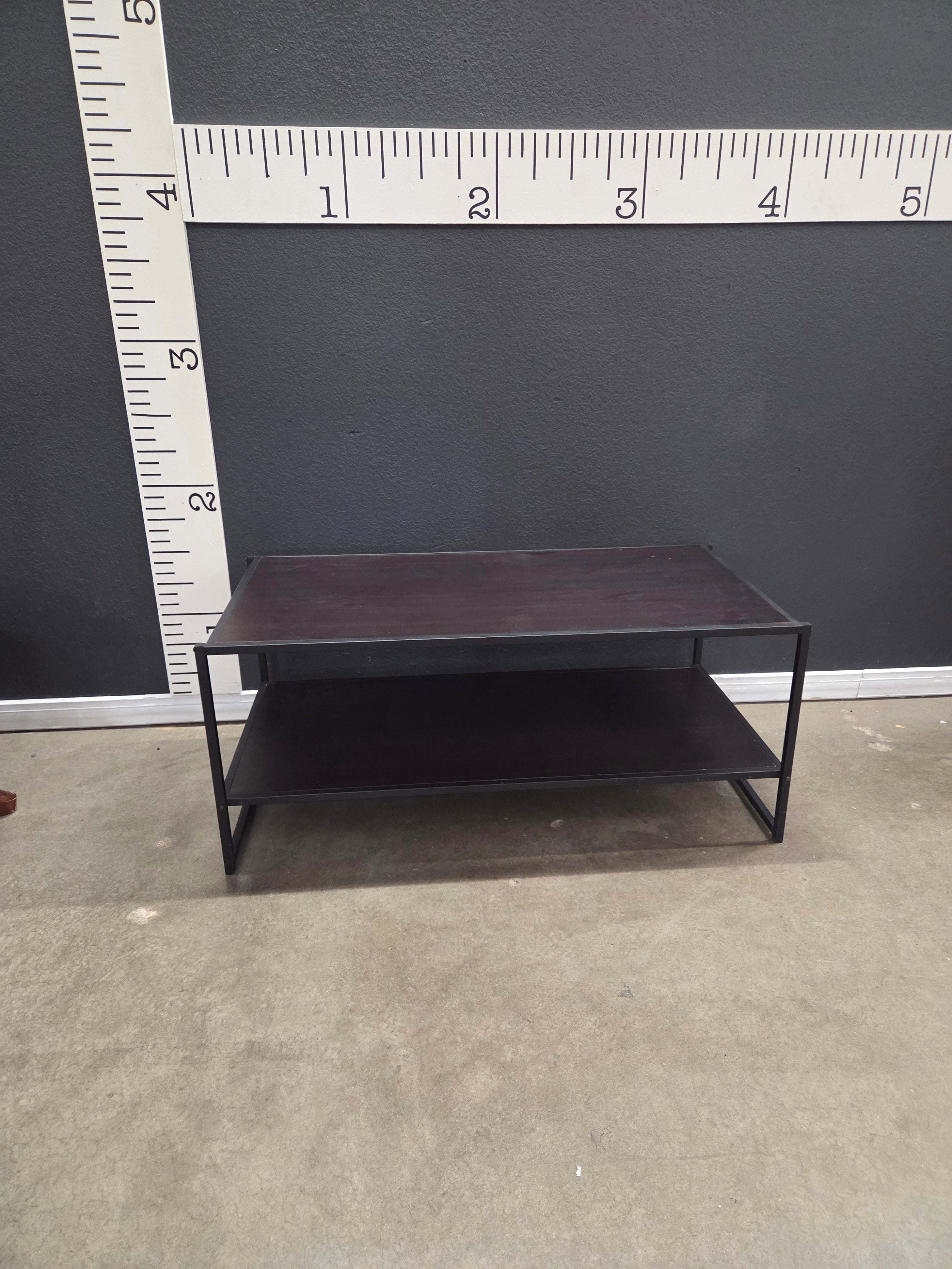 This modern coffee table features a sleek black metal frame with two dark wood shelves, finished in a matte black coating. Perfect for a contemporary living room setting. Approximate Size: 1.5 x 3 x 1.5