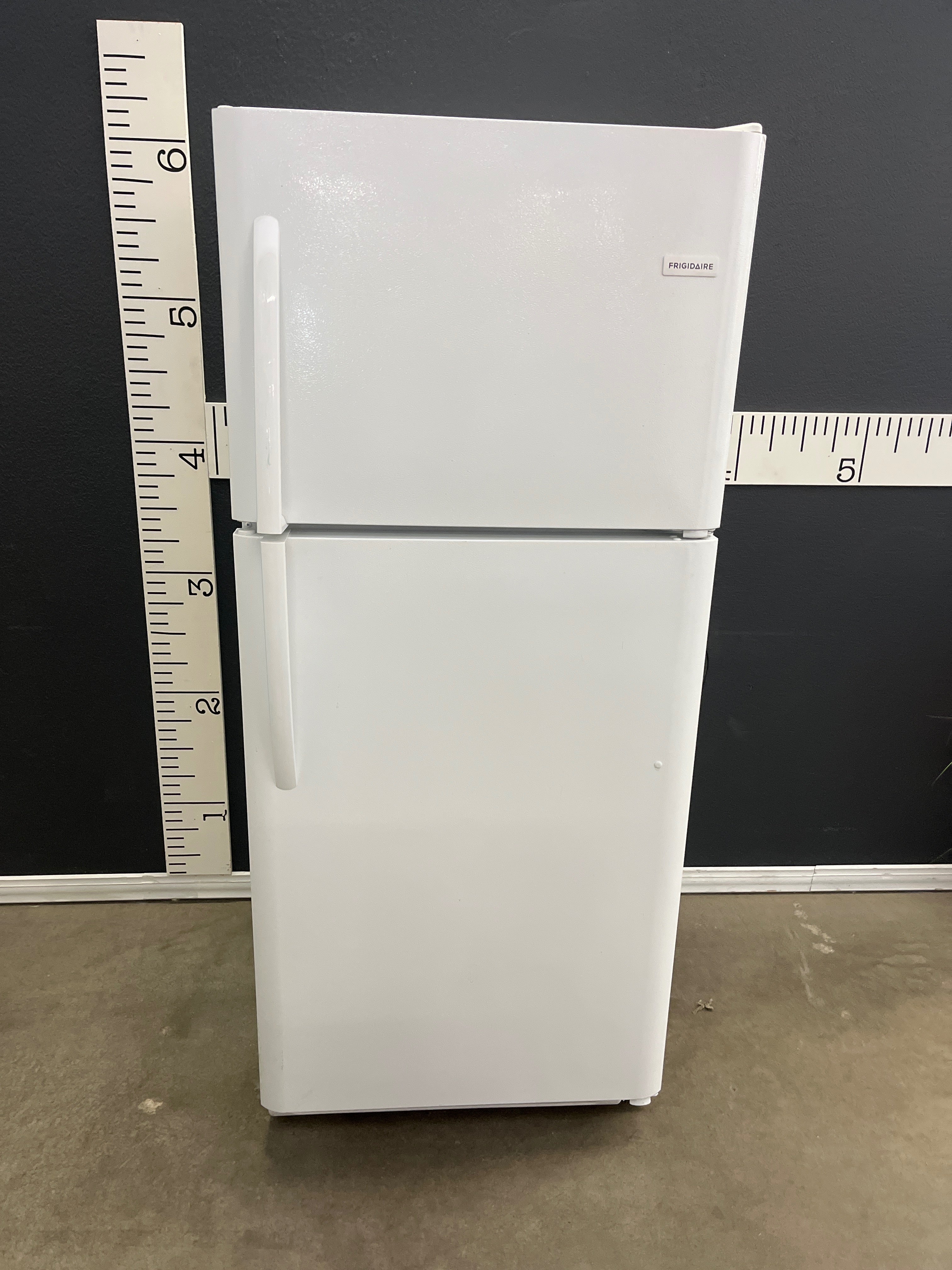 This Frigidaire refrigerator features a sleek white finish, providing a clean and modern look to your kitchen. The appliance has a spacious interior with a top freezer compartment for convenient storage. Approximate Size: 5.5 x 2.5 x 2.5