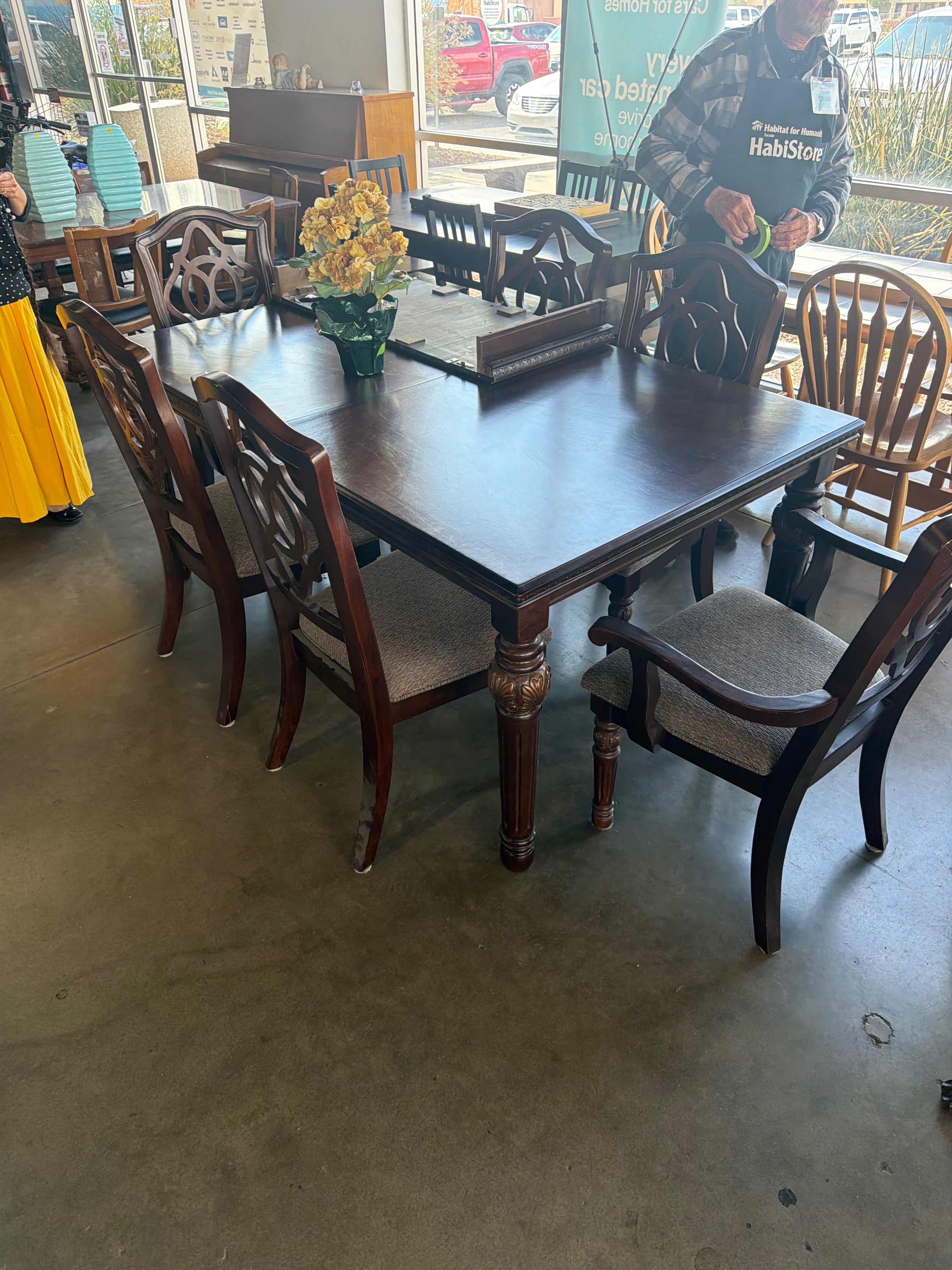 This beautifully crafted dining set features a rich, dark wood finish with intricately carved details. The upholstered chairs are designed for comfort with a neutral fabric that complements the wood's deep tones. Approximate Size: 3 x 5 x 3