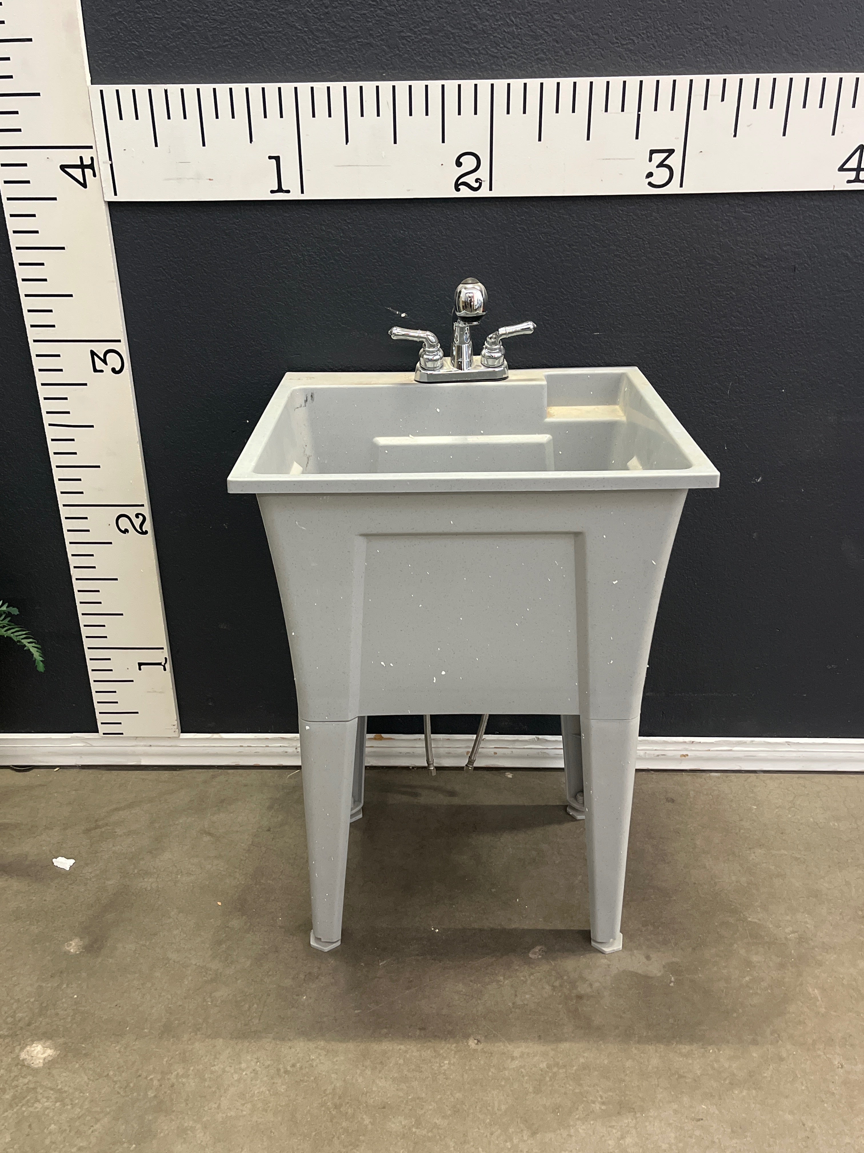 This is a sturdy utility sink with a chrome finish faucet, featuring a sleek gray body with a matte finish. Approximate Size: 3 x 2 x 2