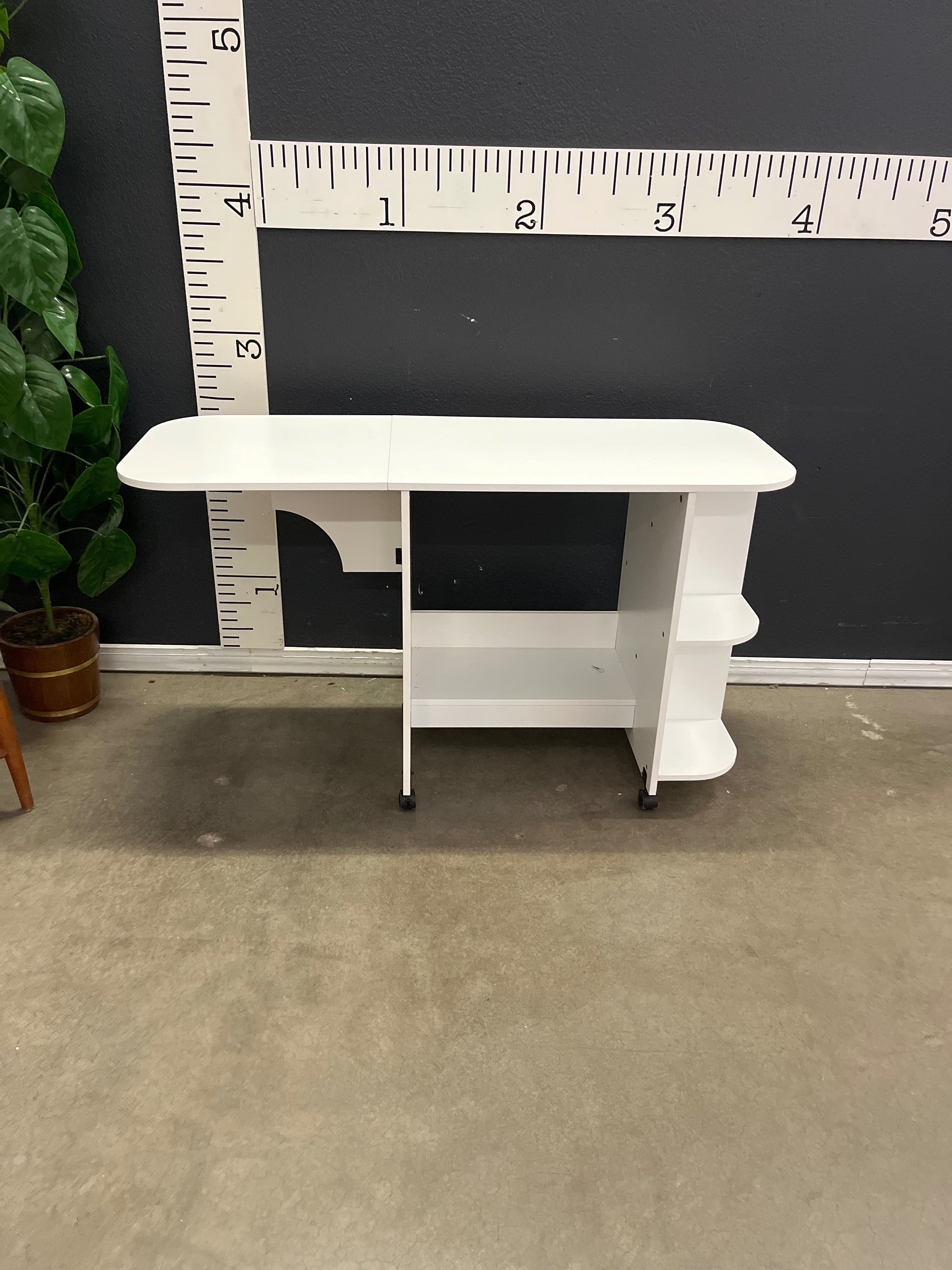 This versatile sewing craft table features a sleek white finish and a compact design that includes convenient storage shelves. Ideal for small spaces, the table can be folded when not in use offering functionality and style. Approximate Size: 2.5 x 4 x 1.5